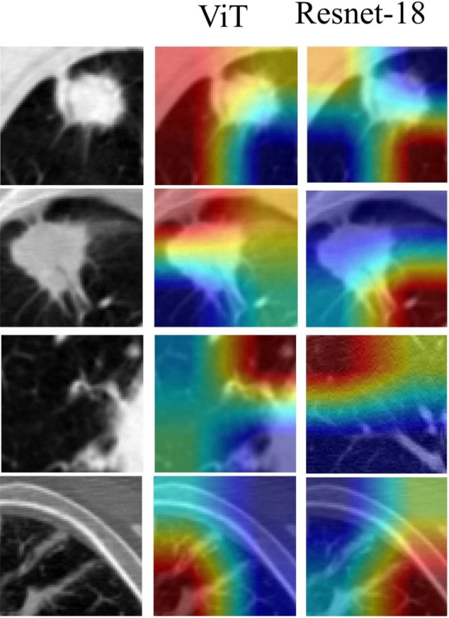 Figure 4. Visualization heatmaps of malignant lung nodule predictions generated by the ViT and ResNet-18 models. Red areas indicate regions of primary focus for the models, while cooler colors represent less relevant regions. The heatmaps show that both models are able to localize key regions associated with malignant features, with the ViT model tending to capture the global contextual information of the nodule, whereas ResNet-18 primarily emphasizes local texture patterns. These visualizations provide an intuitive illustration of the models’ decision-making rationale