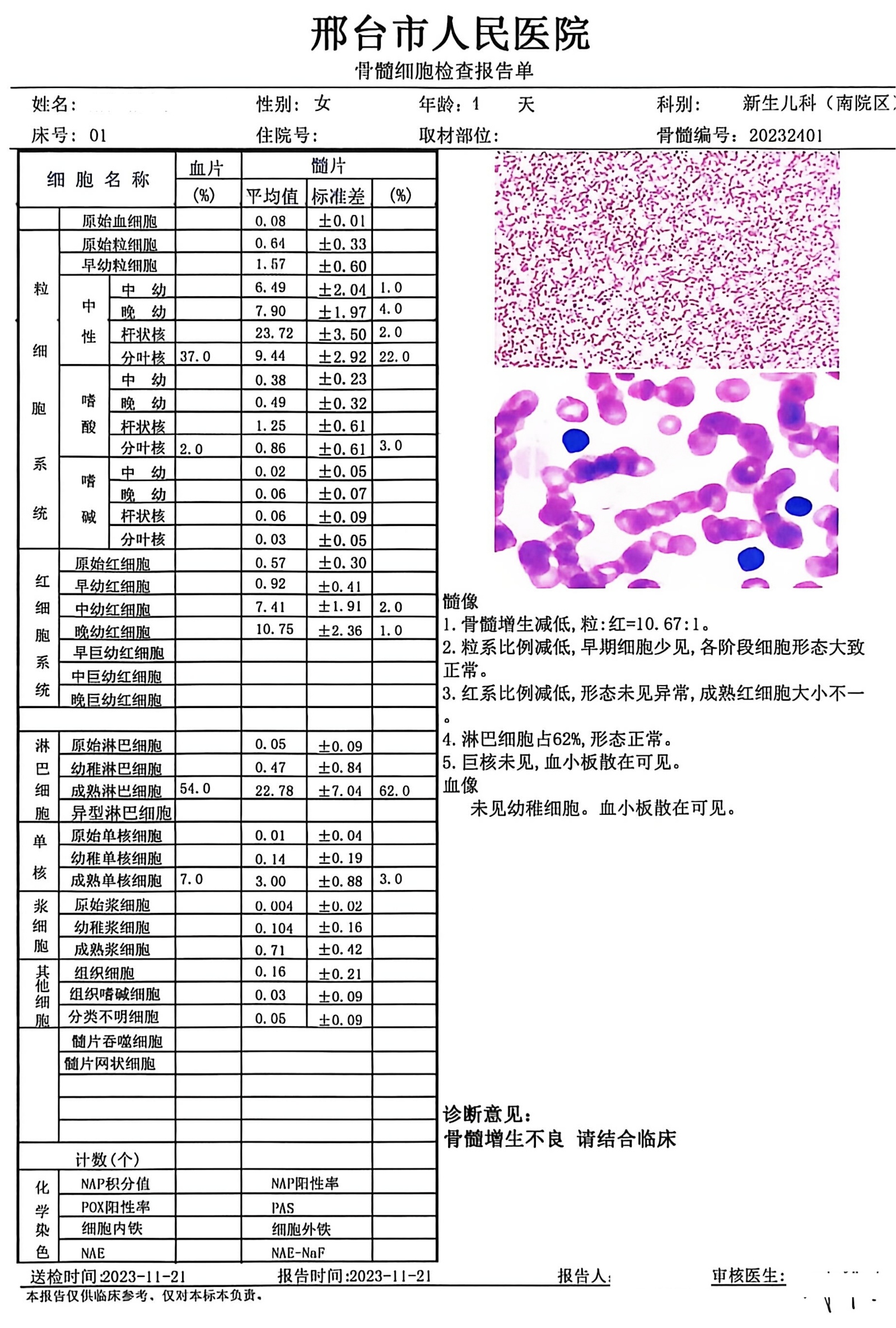 (1) 新生儿溶血性贫血:患儿4天,主因发现贫血3小时入院,但患儿无水肿、肝脾肿大等溶血表现,结合血细胞形态分析、红细胞直接抗人球蛋白试验、游离抗体试验、抗体释放试验等,暂不考虑新生儿溶血性贫血。
