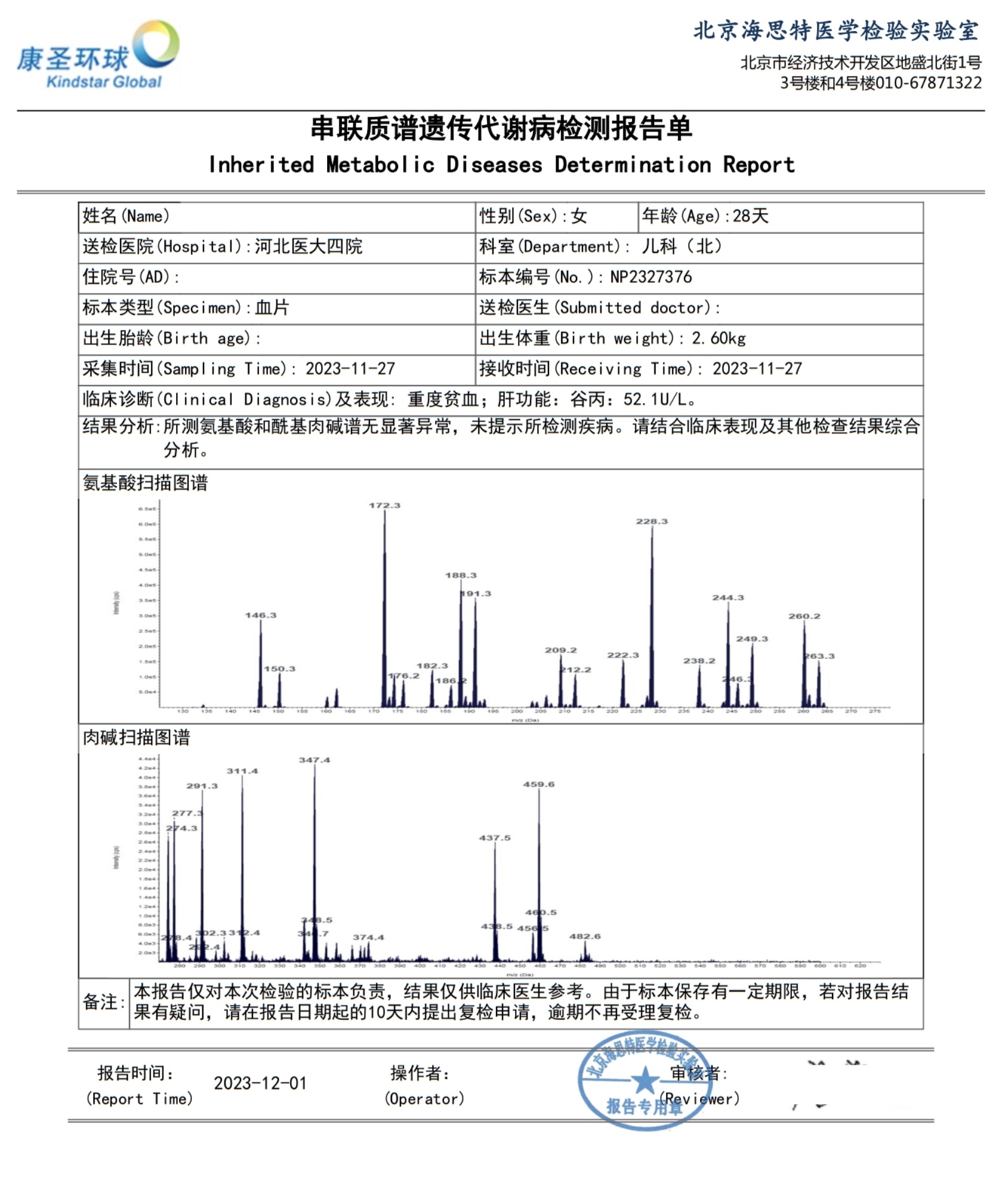 摘要: 病史摘要:患儿女,汉族,4天,主因发现贫血3小时入院。患儿系第1胎第1产,胎龄38周4天足月儿,因其母羊水少行剖宫产分娩娩出,羊水性质清,量少,脐带、胎盘未诉异常,阿氏评分不详,出生体重2600 g。本院监测新生儿溶血病阴性,予多次输注悬浮红细胞后仍存在贫血,转上级医院后母婴血型抗体示MNS溶血。症状体征入院查体:生命体征平稳,精神反应欠佳,无发热,全身皮肤苍黄,未见瘀斑及出血点,巩膜无黄染,口唇欠红润,全身浅表淋巴结未触及,前囟平坦,张力不高,双肺呼吸音粗,可闻及痰鸣音,肝脾不大,脐带未脱,脐周无红肿,肢端暖。诊断方法:依据临床表现及实验室检查,诊断重度贫血、新生儿肺炎、卵圆孔未闭。诊疗经过:给予哌拉西林他唑巴坦抗感染、维生素K1预防出血、AB型Rh阳性悬浮红细胞输注、蛋白琥珀酸铁、维生素B