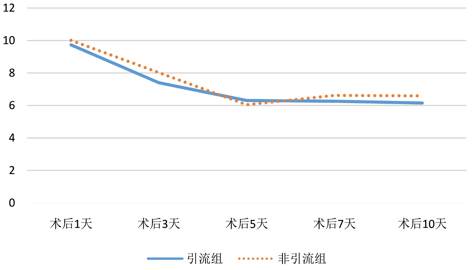 通过独立样本t检验比较WBC得分在不同分组上的差异,经检验术后不同时间点里WBC得分在引流组与非引流组之间均不存在显著的差异,P > 0.05水平。具体数据见表1、图1。