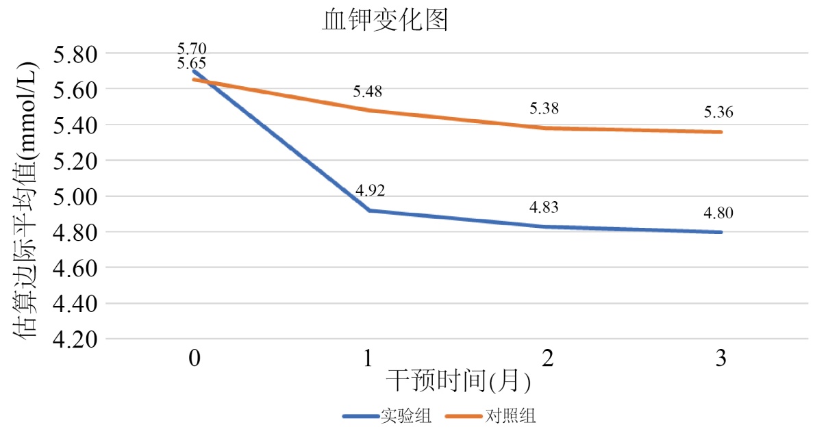 采用多变量方差分析(Multivariate ANOVA)考察干预措施对血钾水平的动态影响。结果显示,实验组