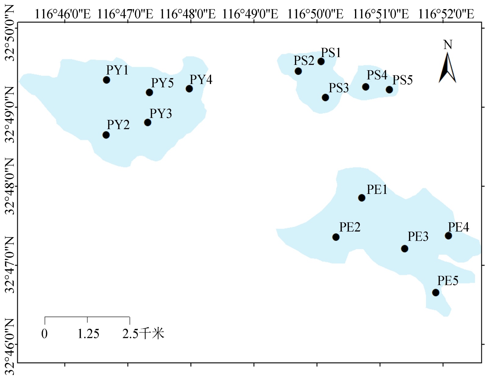 为了客观且全面分析淮南潘集采煤沉陷积水区水质特征,按照地表水监测布点采样原则,并结合当地实际情况,于2023年9月对潘一矿、潘二矿和潘三矿采煤沉陷积水区进行水样采集,采样点分布情况如图1所示,其中PY1~PY5表示潘一矿采煤沉陷积水区采样点位,PE1~PE5表示潘二矿采煤沉陷积水区采样点位,PS1~PS5表示潘三矿采煤沉陷积水区采样点位。