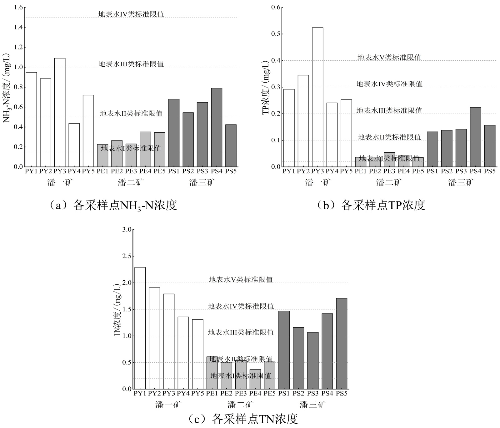 Mn)、总磷(TP)和总氮(TN)在潘一矿污染较为严重,其中TN污染最为严重;(4) 综合水质标识指数法结果显示,潘二矿综合水质标识指数Iwq满足地表水II类标准,潘三矿达到III类标准,而潘一矿仅满足IV类标准,表明水质状况在不同单元之间存在显著差异。