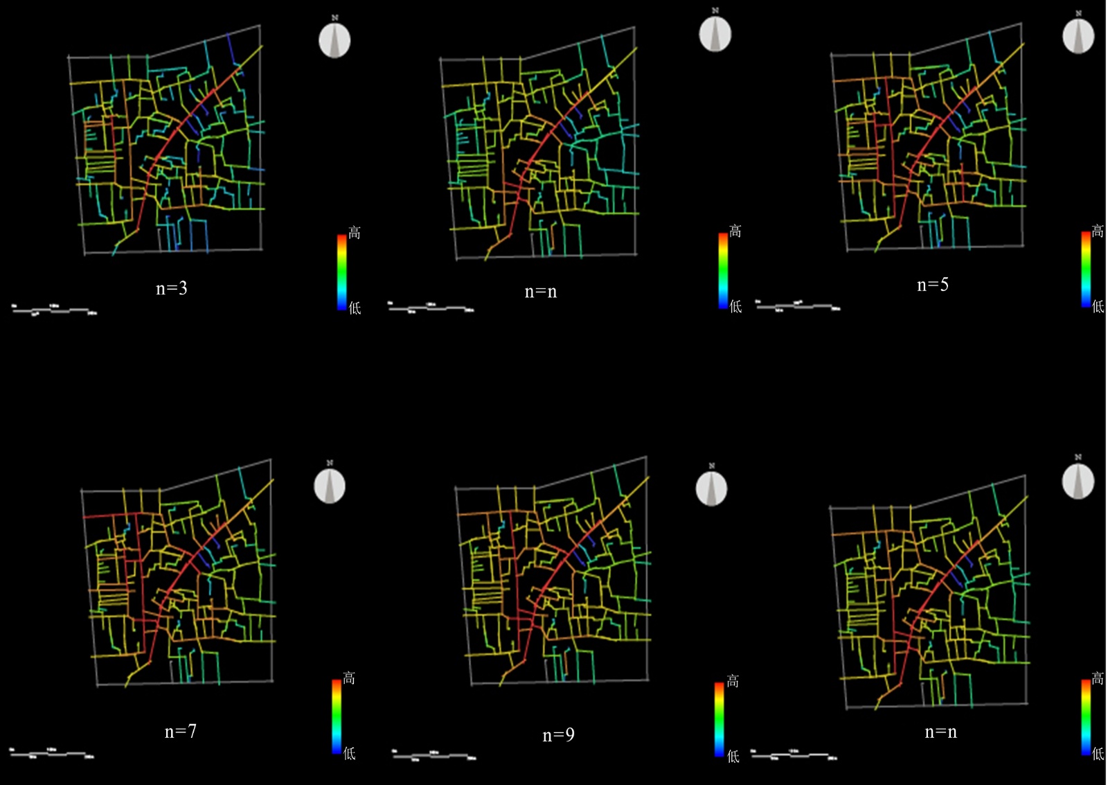 在空间句法分析中,选择度表示某一空间被其他空间单元之间的最短拓扑路线所经过的次数。以A空间为例,在所分析的空间内所有任意两点做最短路线连线,所有穿过A空间的最短段路线之和,就是A空间的选择度。选择度的高低能够表示路段的通行潜力的高低,即该路段被通行的频率[1]。n的不同赋值,反映了不同交通方式下的最短路线。