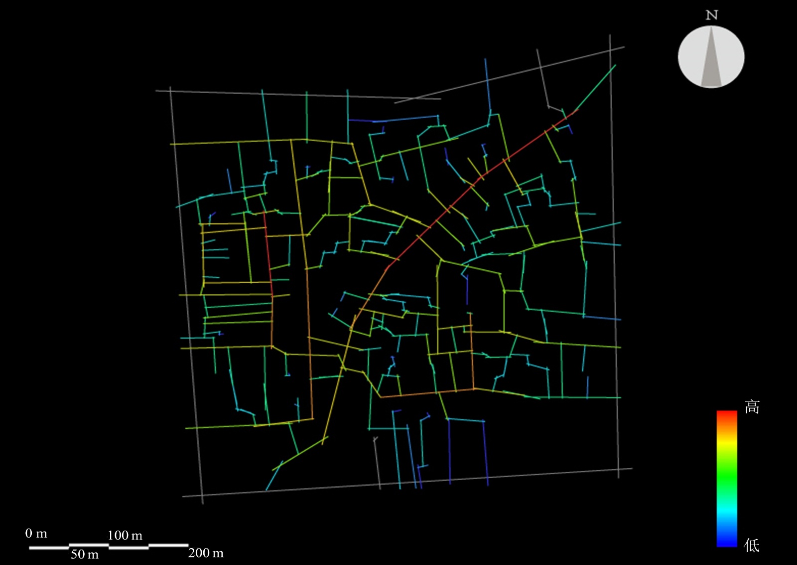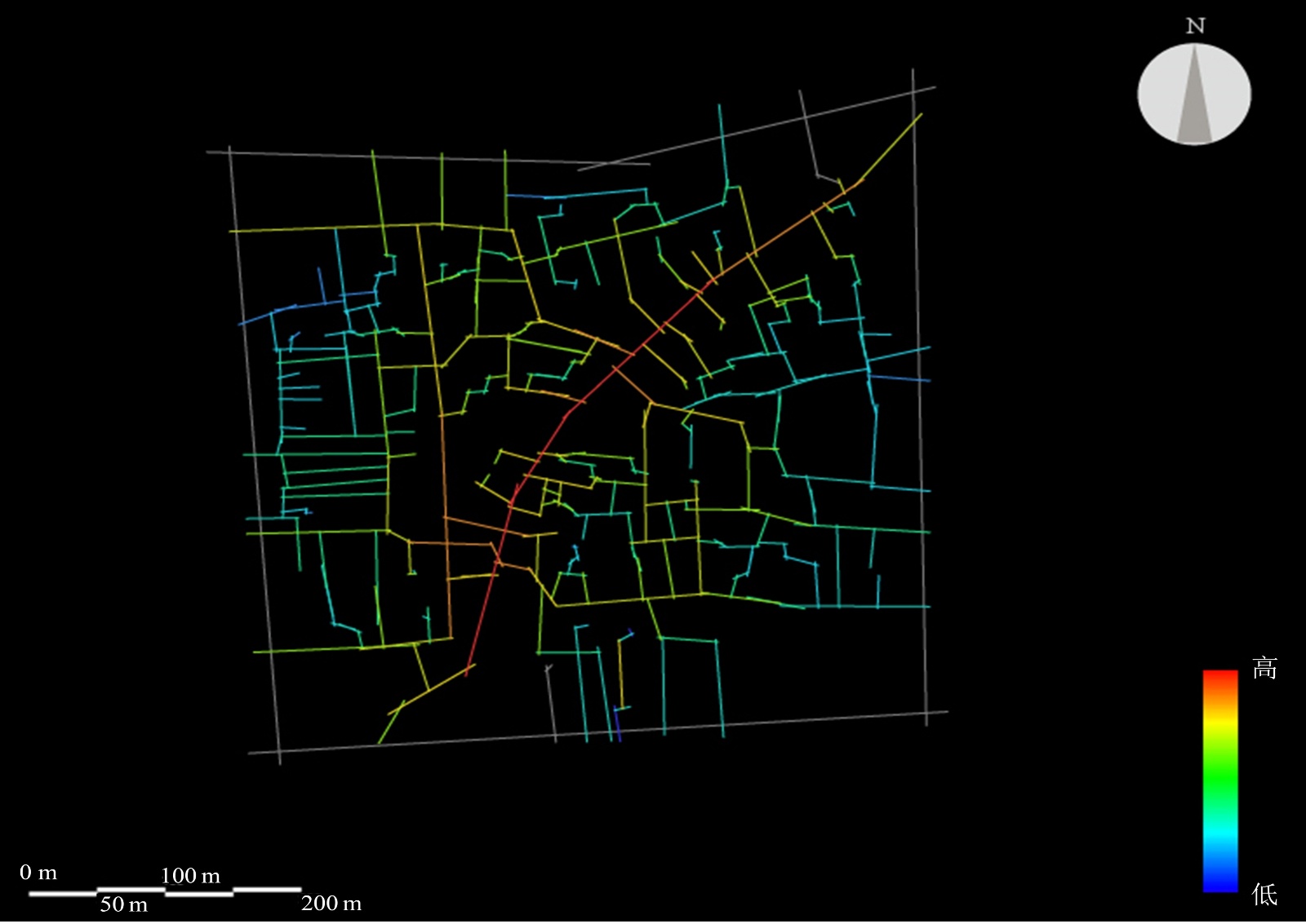 将在AutoCAD绘制好的湾子街历史街区道路图导入Dethmap中,利用软件内置算法生成场地的轴线地图,并进行全局整合度分析运算,得到湾子街全局整合度分析可视化分析图(见图3)。轴线颜色越红代表整合度越高,反之颜色越蓝代表整合度越低[5]。