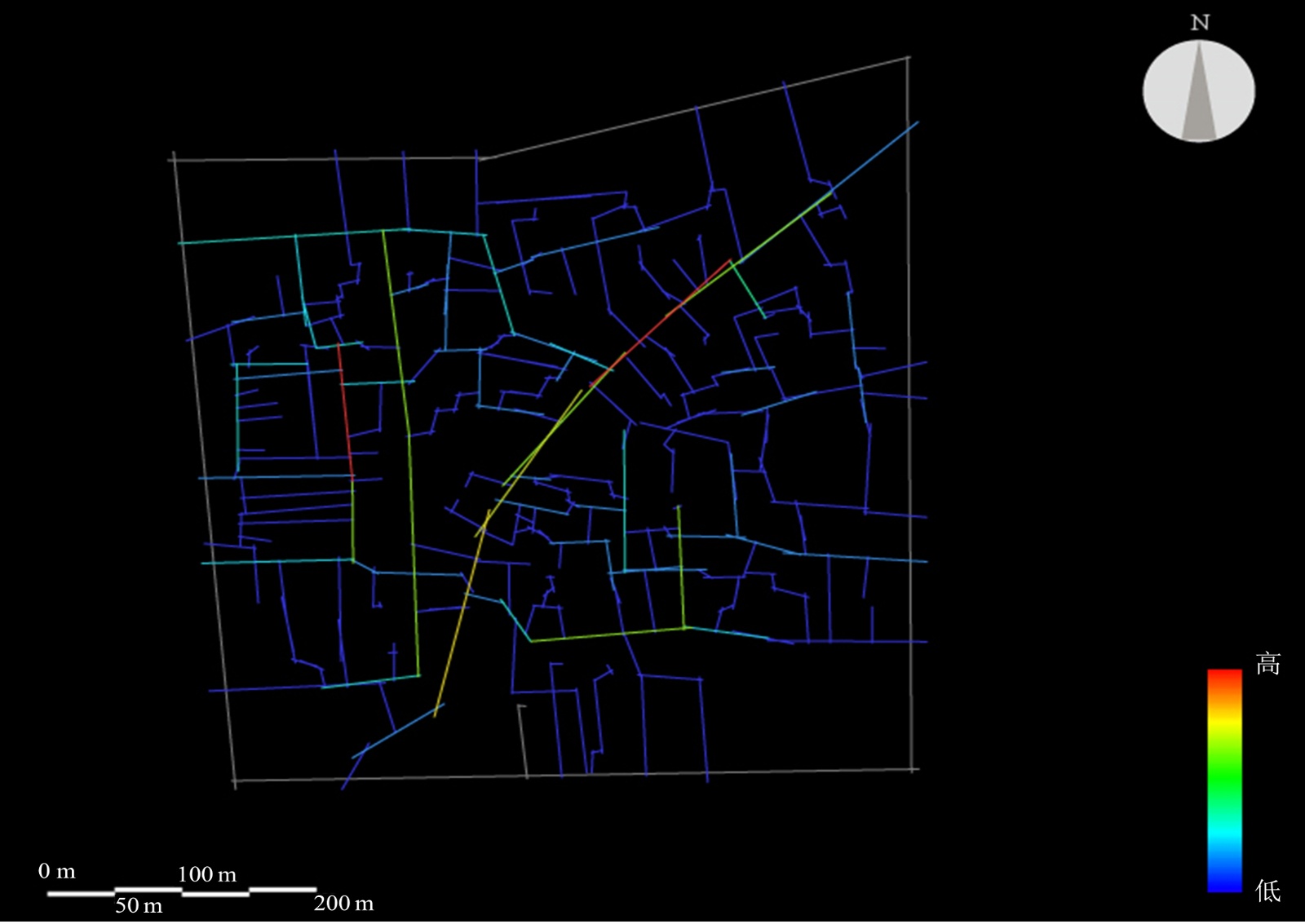 在Dethmap对湾子街历史街区进行选择度分析运算时,通过对拓扑距离n赋值,可以得到不同交通方式下选择度可视化分析分析结果。在运算时对n赋予3的值,因为在3个拓扑距离下最适合游客步行游览,所以得到了当n = 3时的湾子街历史街区的选择度可视化分析图(见图5)。轴线颜色越红代表选择度越高,反之颜色越蓝代表x选择度越低。