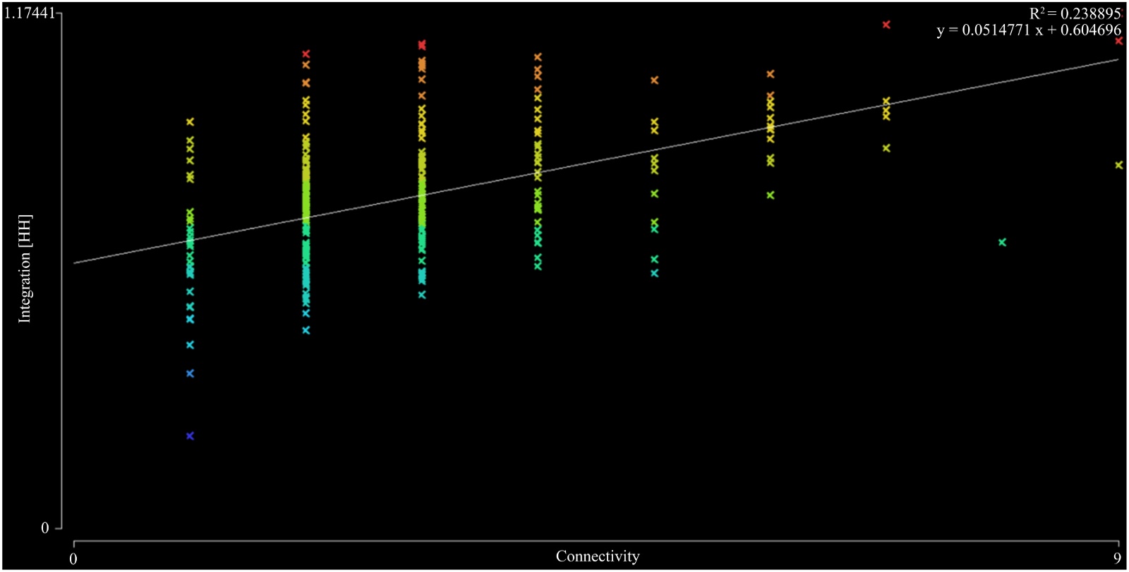 x = Connectivity (连接值),y = Integration.n (全局整合度),y = 0.0514771x + 0.604696,R2 = 0.238895 < 0.5。