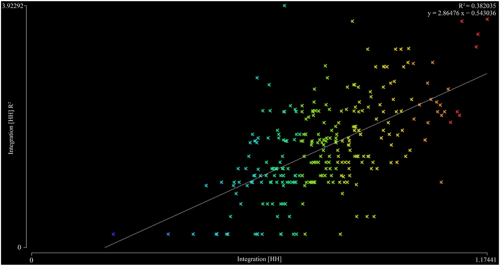 x = Integration.n (全局整合度),y = Integration.R2 (局部整合度),y = 2.86476x + 0.543036,R2 = 0.3382035 < 0.5。