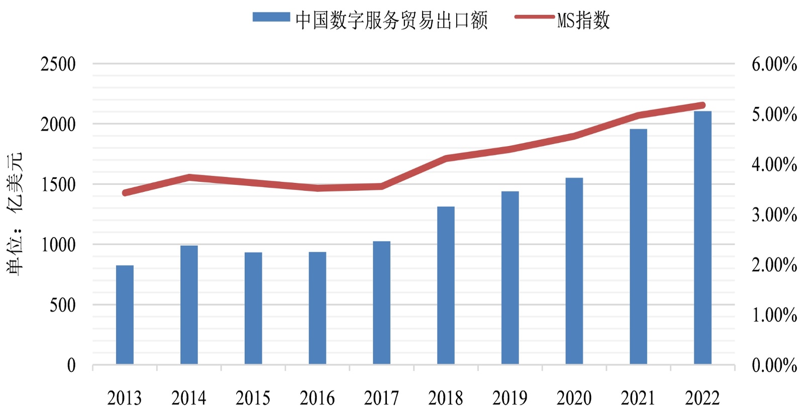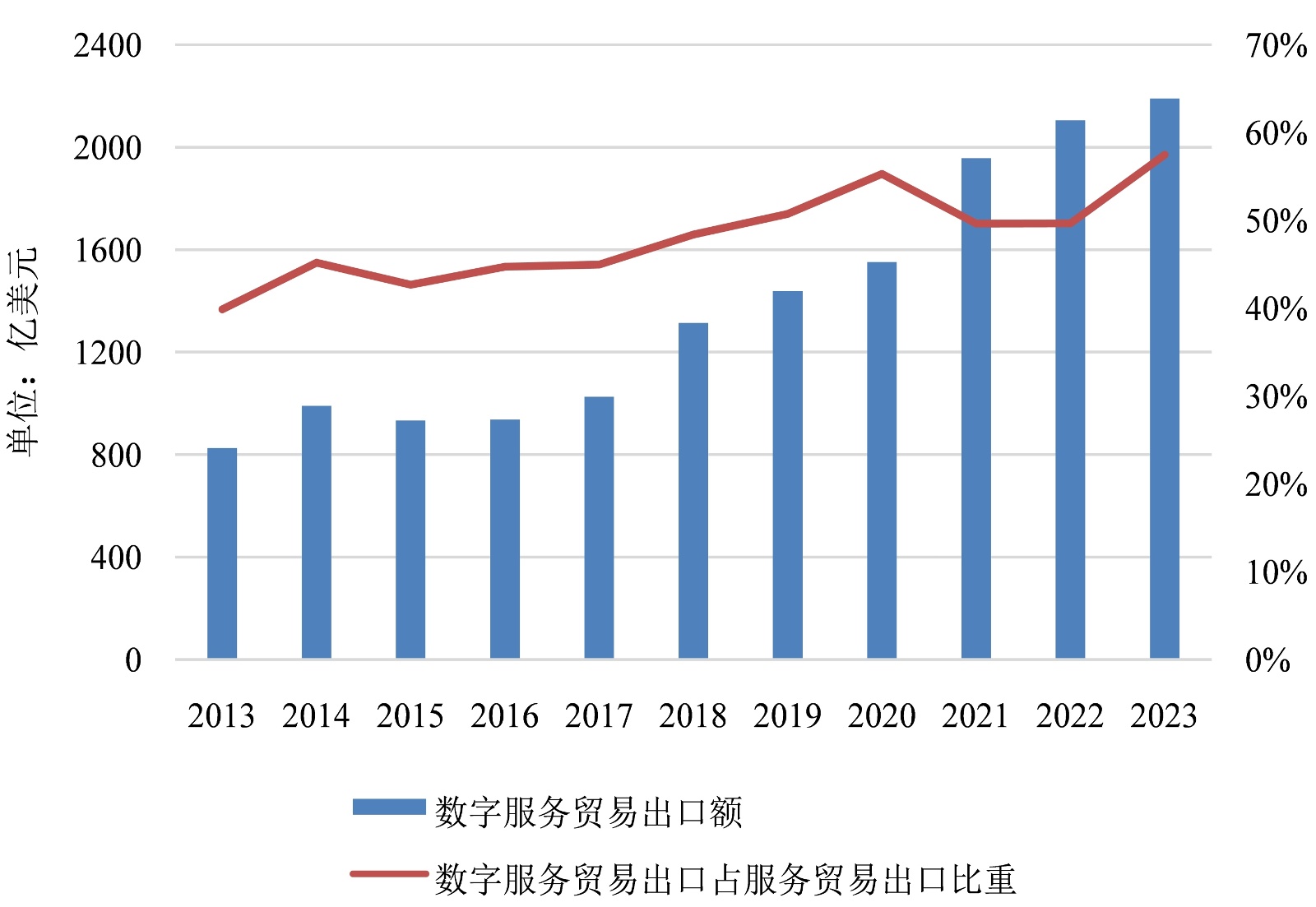 技术创新在互联网、云计算、大数据以及人工智能等领域的加速推进,催生了传统产业领域内的转型与演进。这些技术进步不仅提高了行业效率,也重新塑造了产业结构和经营模式,服务产业数字化发展的趋势同样日益明显。数字经济作为新兴的经济形态,正以前所未有的速度和广度重塑全球的资源配置,它不仅仅是对传统产业的一种补充和增强,更是在全球化进程中推动着要素资源的重新配置,进而影响着世界经济格局的整体走向。在此背景下,世界各国以数据流为牵引,以数字交付为特征,以数字平台为载体的数字服务贸易快速发展。我国通过数字方式向海外提供的服务在2023年上半年达到了2190亿美元,较2013年同比增加了165%。