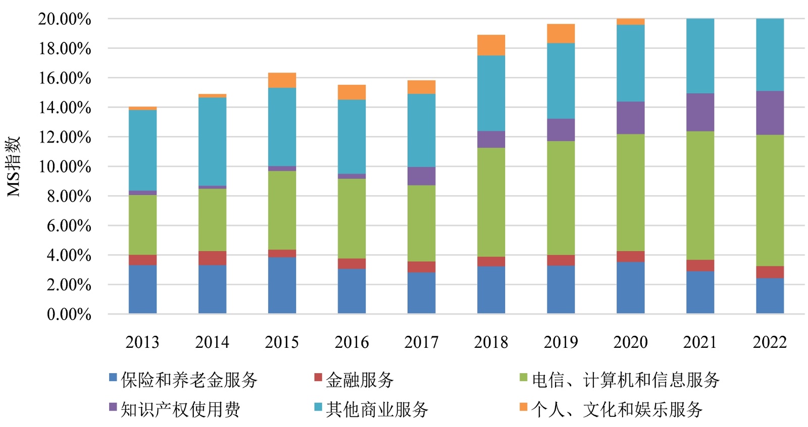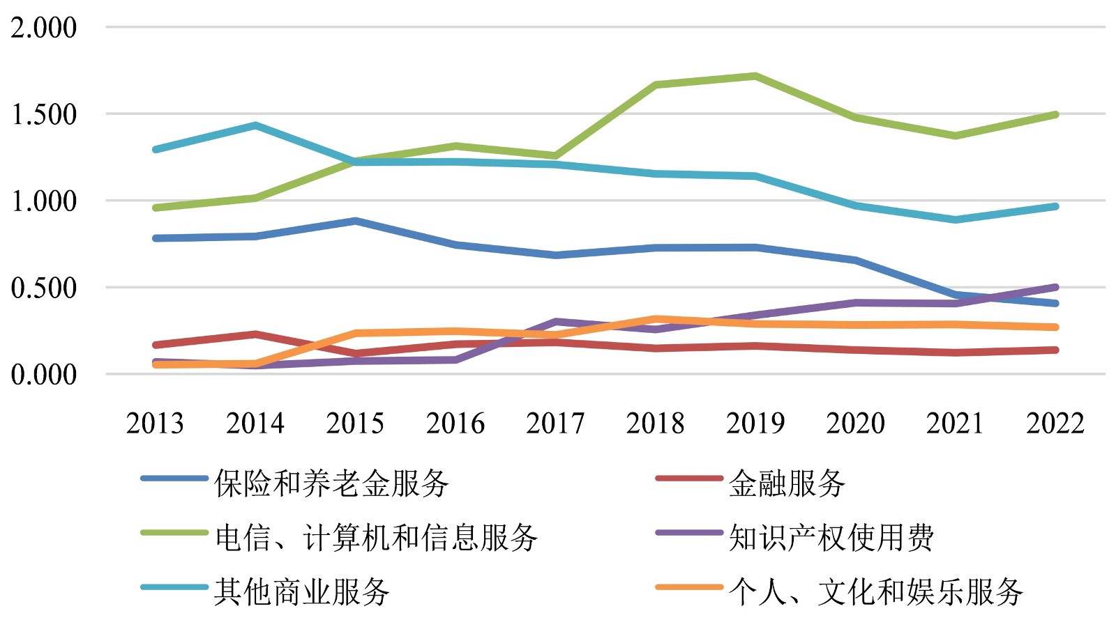 从图1可以看出,中国的数字服务出口额整体上显现出上升趋势,在总服务出口中的比重亦有增加。以2019年为例,中国数字服务出口达到了1439亿美元,占总服务贸易出口的51%,这意味着数字化服务贸易的出口额已经超过了传统服务贸易出口总额的半数,2020~2022年受疫情冲击,出口占比在2021年出现下滑,但在2023年出现回升。