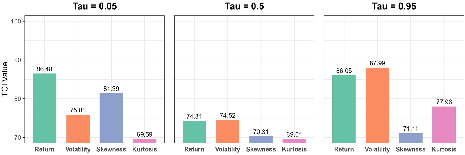 图2呈现了收益率、波动率、偏度和峰度在不同分位数下的总溢出指数,直观展示了各维度风险溢出的整体强度差异。结果显示,总溢出指数呈现显著的“U形”分布特征,极端分位数(tau = 0.05和0.95)的总溢出指数普遍高于中间分位数(tau = 0.5),如收益维度在tau = 0.05和0.95时的总溢出指数分别为86.48和86.05,显著高于tau = 0.5时的74.32;波动维度在tau = 0.95时达87.99,远高于tau = 0.5时的74.52,表明行业间溢出关联程度在极端市场状态下显著增强,体现出典型的尾部风险集聚现象。这一发现对中国能源金属行业的政策制定和风险管理具有深远影响,表明常规市场条件下设计的风险模型严重低估极端情况下的系统性风险,投资者需调整资产配置策略以应对行业尾部风险的非线性放大效应,而监管机构则应关注跨行业风险传导渠道,构建更具韧性的监管框架。