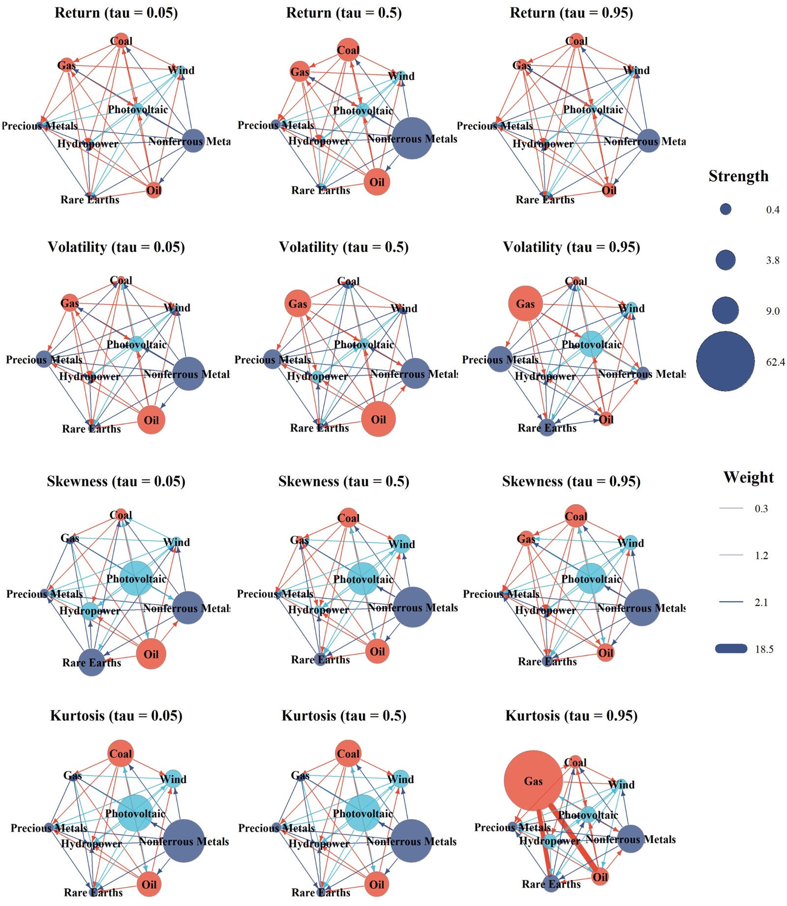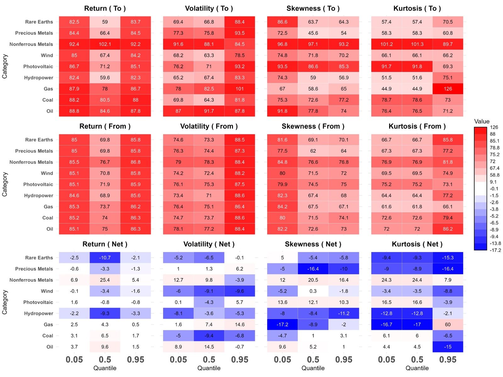 图3通过QVAR模型揭示了不同行业在极端和中性市场状态下的多维风险溢出结构。总体来看,传统能源和有色金属行业在收益率、波动率、偏度及峰度风险溢出中均发挥着核心的传导作用,是系统性风险的主要净溢出源。新能源和稀土行业主要作为风险的净接收者,承受来自传统能源和金属行业的尾部风险传导。此外,极端市场状态下的溢出强度明显高于中位数,说明尾部风险传递具有显著的非对称性和加强效应。这些结果反映出中国能源金属行业多市场、多维度风险溢出的复杂动态特征,为理解国际油价及传统能源价格波动对新能源和金属行业风险影响提供了详实的实证支撑。