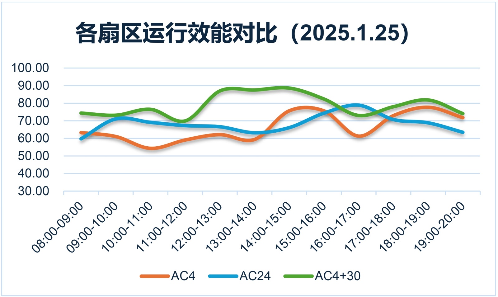 2) AC4 + 30融合扇区的效能值在绝大多数时段持续显著高于AC4独立值,量化证实了高低扇协同运行对释放系统容量、提升整体效能的实质性贡献。这一示例表明,本理论框架所构建的运行效能评估体系,能够成功地将复杂的运行状态转化为具有明确管理含义的量化信号,为空域资源协同优化等决策提供了直接的数据支撑。