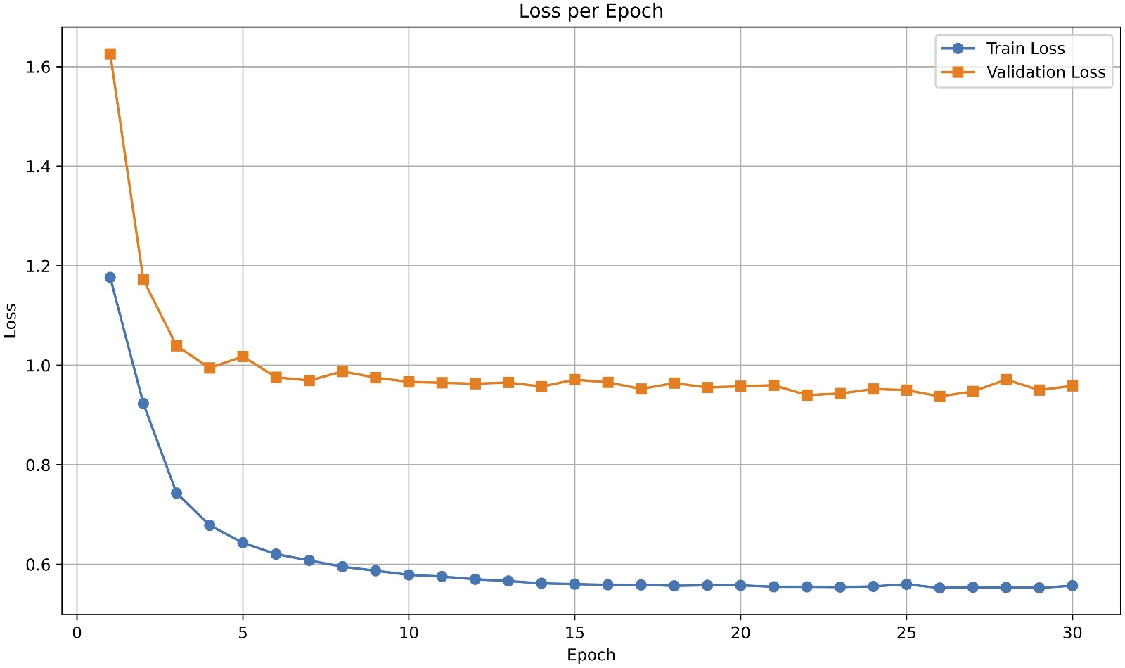 (3) 模型训练阶段:模型的损失函数使用MSE,优化器选用Adam,初始学习率设置为1 × 10−4,批次大小设为64,最大训练轮数为30。为抑制过拟合并提高泛化能力,训练过程中引入早停机制(patience = 5),以验证集MSE作为监控指标,连续5个epoch未取得精度提升则终止训练。图4展示了训练集与验证集Loss随epoch变化的曲线,训练Loss在前8轮快速下降,随后进入平稳收敛区间,验证Loss在第15轮达到最低值0.95并保持平台震荡,未出现明显回升,表明模型已充分收敛且无过拟合风险。总体而言,Loss曲线平滑、无尖刺,说明学习率、批次大小等参数设置合理,训练过程稳定。