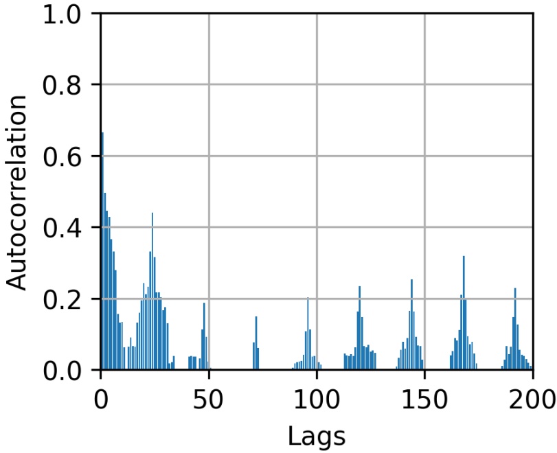 为时间序列值的均值。当滞后时间k与数据的周期对齐时,ACF值会显著上升,最大的峰值对应于与数据集中最大周期长度对齐的滞后时间;反之,若数据缺乏周期性,则不会观察到显著的峰值或谷值。