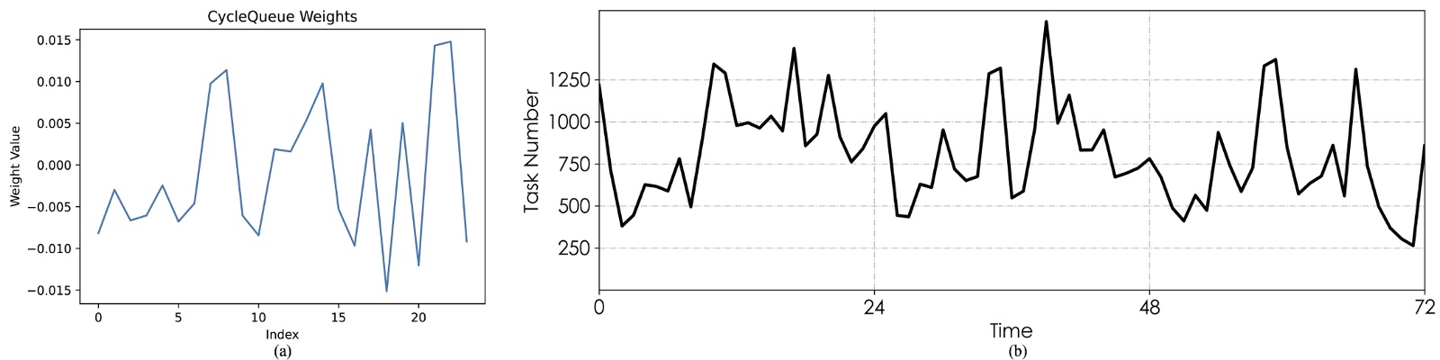 为进一步增强模型的可解释性,本小节对模型从历史数据中学习得到的周期模式进行了可视化,如图6(a)所示,并与图6(b)所示的部分原始任务数量变化情况进行对比。可以观察到,模型所学习到的周期模式在结构上与真实任务数量的分布高度一致,说明模型能够有效识别到周期内不同时间段任务数量的差异,并在预测过程中对关键时间位置赋予更高关注度。此外,相较于原始序列中存在的随机波动,模型学习到的周期模式表现出更加平滑且稳定的峰谷结构,说明所提出方法更侧重于捕捉跨周期重复出现的稳定周期特征,而非对短期噪声进行过拟合。