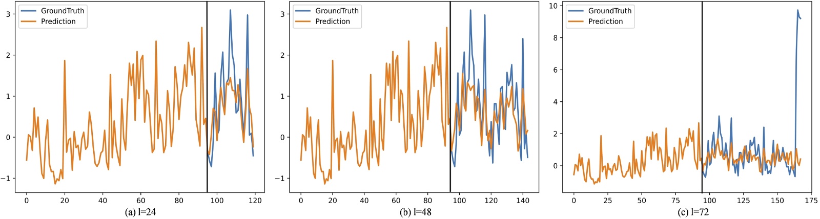 为进一步评估模型在不同预测步长下的性能表现,本小节展示了在相同历史输入条件下,预测步长分别为24、48和72的代表性预测结果,如图8所示,其中黑色竖线表示预测区间的起始位置。从预测结果可以看出,在预测步长为24时,模型预测曲线在幅值和相位上均与真实序列保持较高一致性,能够较准确地刻画周期性波动及其局部峰谷结构。随着预测步长增加至48和72,预测结果整体趋势仍与真实序列保持一致,但在局部剧烈波动区域,预测曲线与真实值仍有较大误差,对突发尖峰的刻画能力稍有不足。这表明在一步生成较长预测序列时,模型更倾向于优先保持整体周期结构与长期趋势的稳定性。