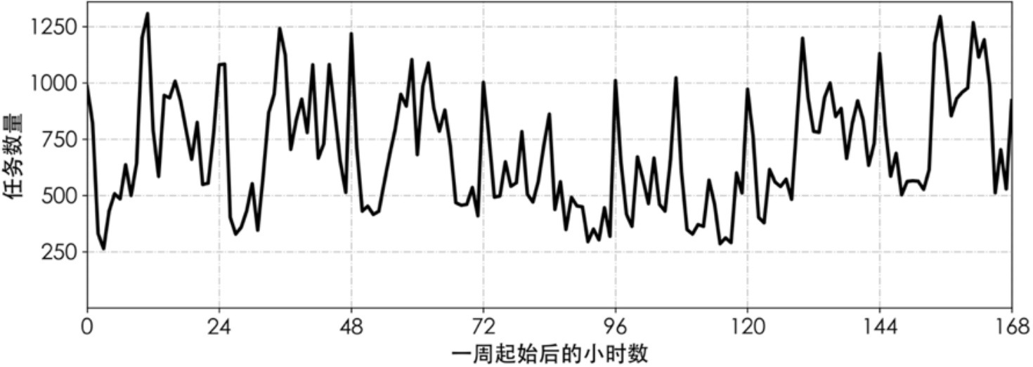 用户请求使用云计算服务,其行为因人类活动规律、业务运行等因素呈现出显著的周期性,例如应遵循自然昼夜规律,大多数用户在白天提交使用服务任务,而晚上提交的频率较低;或因企业策略和运营制度,大型电商平台在大促销期间业务量激增,会需要更多的云资源以维持其运行。周期性不仅在客观上存在,通过历史数据也可观察到任务提交数量在每日存在显著的波峰、低谷波动,如图1所示。
