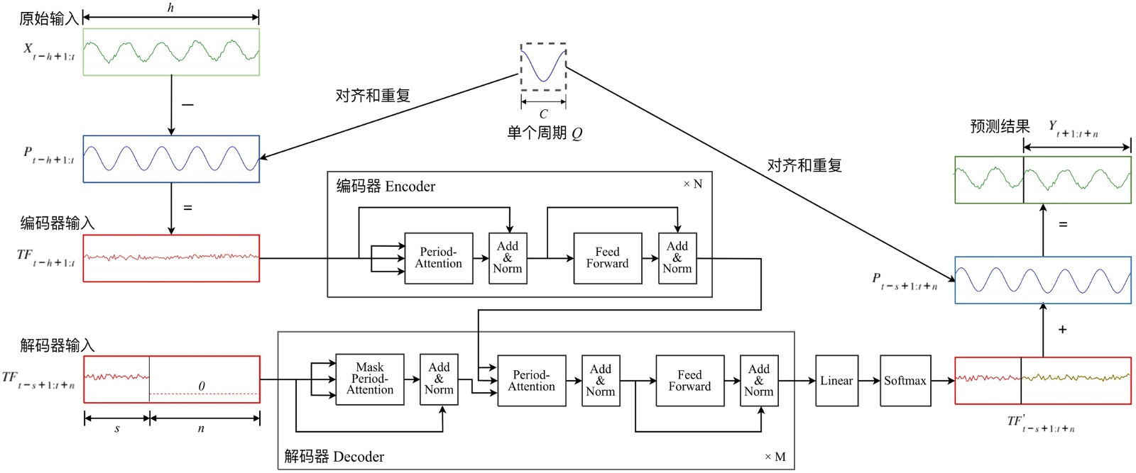 (3) 趋势–波动建模:将时间序列中去除周期后的非周期部分输入Transformer模型,捕捉时间序列中长期趋势与随机波动部分;