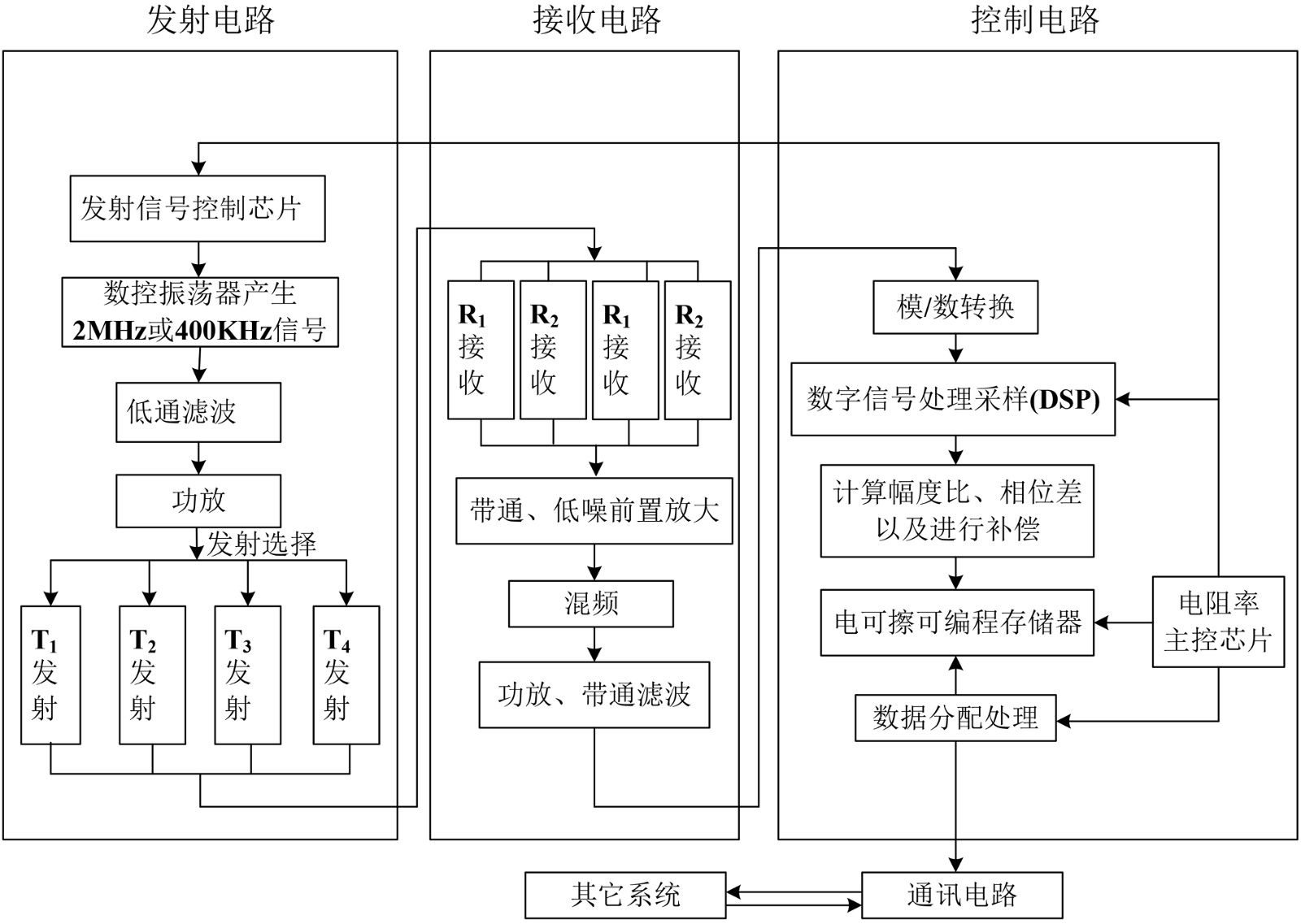 振荡器产生2 M或400 K的信号,信号经过低通滤波以及功放后,由T1线圈发射2 M电磁波。接收线圈R1、R2分别接收原始信号,原始接收信号经过带通、低频前置放大后进行外差降频,在低频情况下进行采样、计算。此后T1发射线圈发射400 KHz的信号。T1发射后,T2、T3、T4线圈依次发射。重复以上步骤。计算结果存储到存储器中。同时电阻率主控芯片与外部通讯,接收指令并执行发送数据等指令处理。