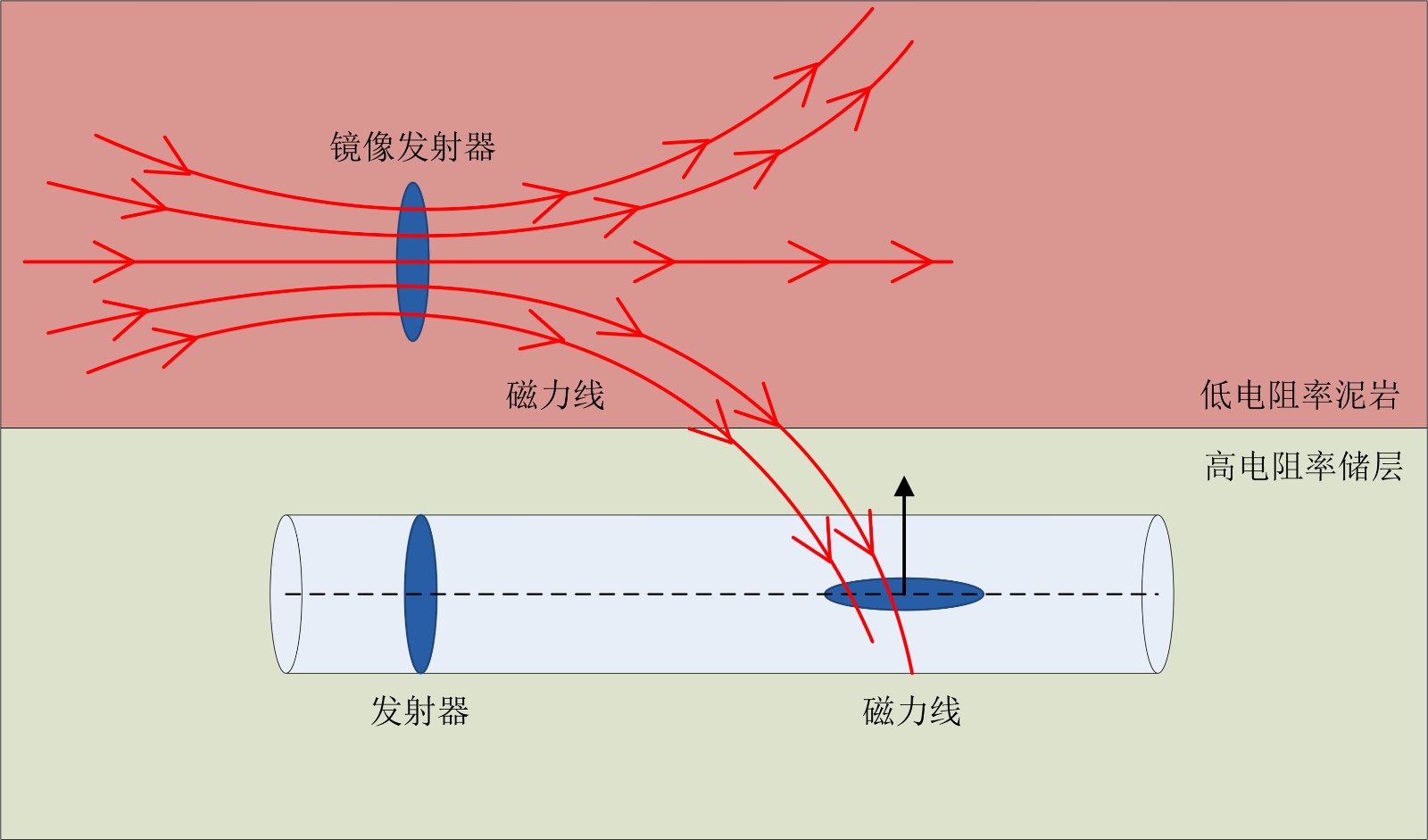 当发射天线轴向,接收天线横向时,此时接收天线的信号全来自于围岩的影响,可用镜像原理解释[6],如图6所示,通常目的层为高阻地层,围岩层为低阻地层,当不存在围岩或离围岩比较远时,此时接收器只接收发射器的信号,而由于发射器和接收器在同一轴线且相互垂直,则接收器的信号为零;当靠近围岩时,根据镜像原理,则发射器会在围岩中等效出一个镜像发射器,此时接收器的信号全部来自于镜像发射器,而镜像发射器信号的大小则取决于目的层和围岩的电阻率对比度以及仪器与地层边界的距离,即接收器信号大小取决于电阻率对比度以及仪器与地层边界的距离。此时方位探测信号定义为接收天线信号的虚部。