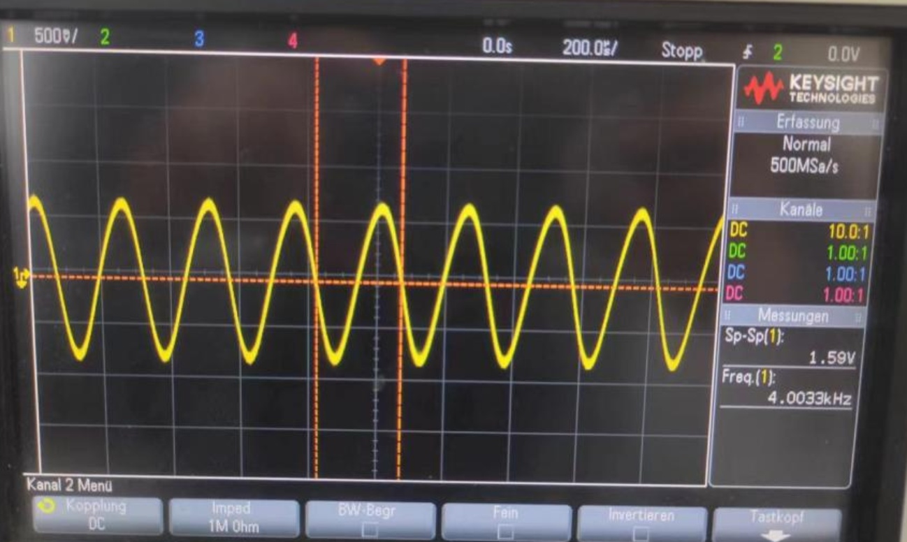 对方位电磁波电阻率原理系统进行测试,如图13所示。方位电磁波电阻率原理系统的测试流程如下:采集控制电路向发射电路发送指令,发射电路收到指令后通过相应的发射天线发射2 M或400 k信号,纵向天线连接的接收电路处理来自纵向天线的接收信号后输出下变频后的4 k信号波形,水平天线连接的接收电路处理来自水平天线的接收信号后输出下变频后的4 k信号波形,采集控制电路AD采集这些处理后的下变频信号进行计算,并将采集到的原始数据及计算结果通过串口发送到PC串口接收软件,通过串口接收软件观察计算结果,也可将原始数据或计算过程中的数据存储后绘图观察。图14为处理后的纵向天线下变频后的信号波形,图15为处理后的水平天线下变频后的信号波形。