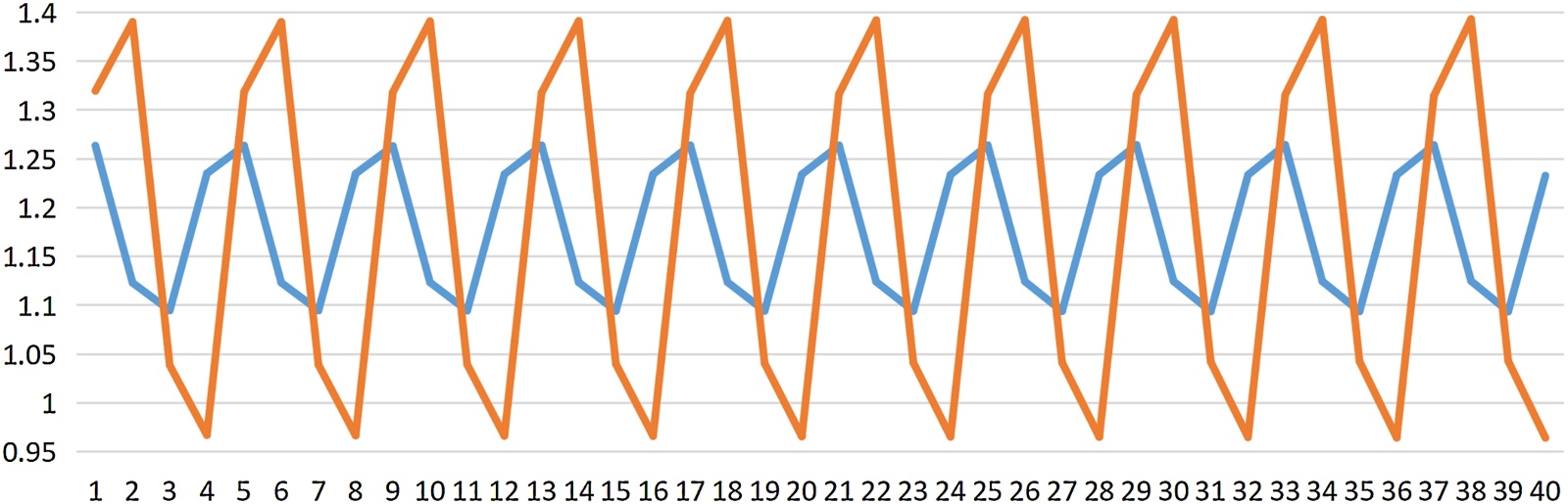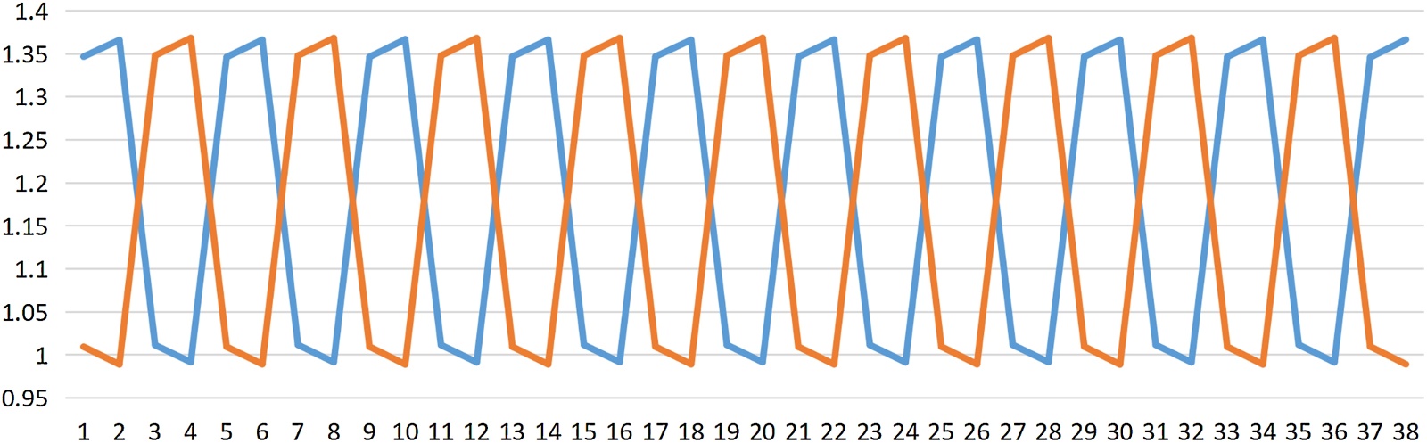 Figure 19. Diagram of the amplitude ratio calculation fluctuation of two-way received signals from the acquisition and control circuit (with a phase difference of 90˚)