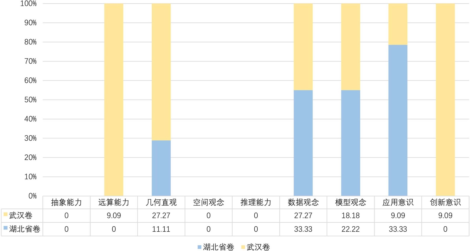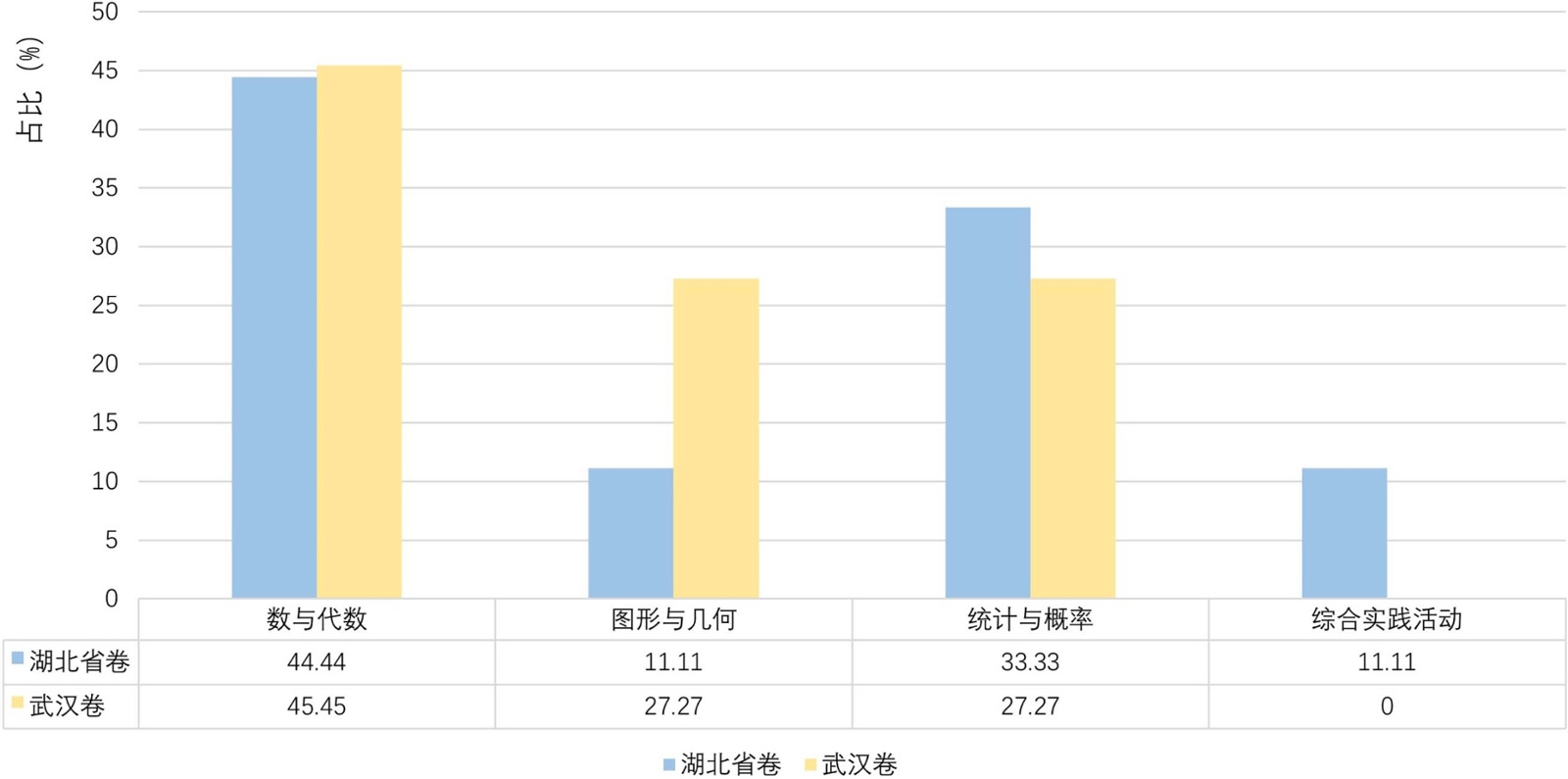 从图1中,可以看出两份试卷均以单领域单部门类型为主,分别占总数的77.78%和63.64%,体现出中考试题以考察核心知识点为主。此外,两版试卷包含了单领域多部门的情境,其中武汉卷所占比例更多。湖北省卷包含了多部门多领域的试题情境,注重了与其他学科的联系,例如第13题与物理学密度知识相联系,而武汉卷对此尚未涉及。