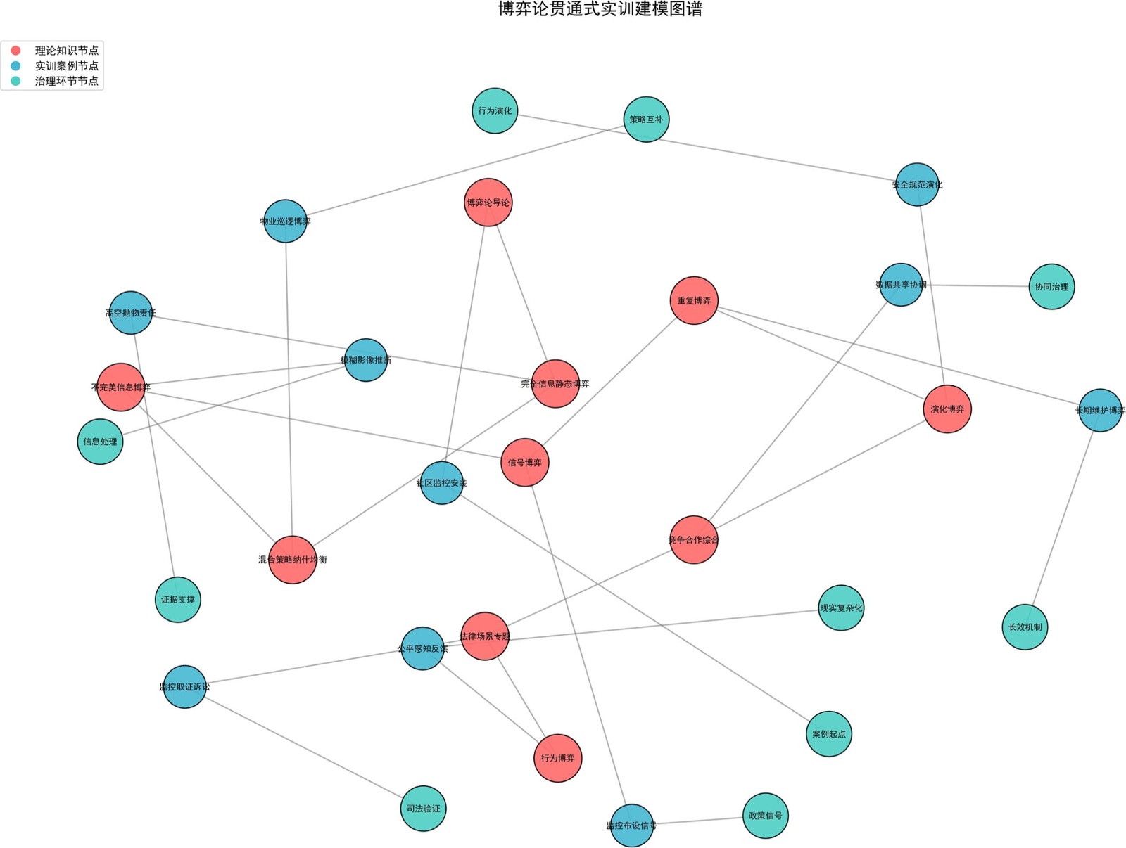 在教学实施过程中,本课程特别强调学生建构博弈模型的能力训练。引导学生从复杂的治理情境中准确识别参与主体,包含直接利益相关者与规则制定者等。接着引导学生进行策略空间的界定,帮助他们对各主体可行的行动方案进行系统梳理。最终对收益来源进行探查,让学生识别各方关注的核心价值和相关的权重系数。通过这个训练,可以培养学生的抽象思维能力。让学生在质性建模的过程当中,把社会问题转化为相应的博弈模型。本研究建立了模型中的案例节点与治理节点的知识图谱,直观呈现了质性建模过程中各要素的复杂交互关系(见图1)。