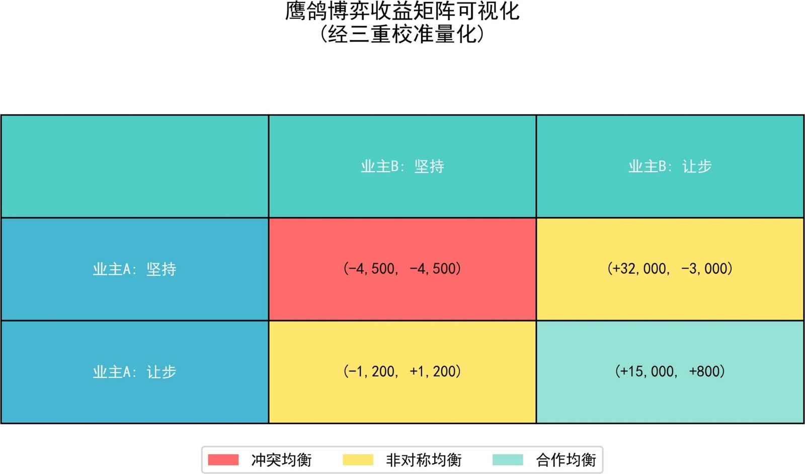 在具体的案例要素构建过程中,教师会指导学生检索政府采购平台中同类设备的中标价格。例如,通过对2024年上海市政府采购平台相关招标数据的分析,综合评估“人脸识别摄像头及配套云台系统”的采购均价约为每套3.2万元,这为公共安全价值参数的确定提供了较为准确的参考。进一步对全班50名学生采用行为意愿调查的方法,模拟“居民”对隐私偏好的真实评价。调查发现,对个人隐私较为关注的“住户”平均愿意每年支付1200元,用于换取摄像头的角度调整。这为隐私价值的量化分析提供了合理合法的数据参考。课堂上,教师引导学生采集分析中国裁判文书网中的相关判例,结合时间成本对冲突成本进行参数估值。司法案例折价中使用的1.5倍时间成本系数,主要用于演示如何将诉讼时长、机会成本等非货币因素纳入分析框架的教学假设。为直观展示该方法的教学流程,课程设计了标准化的数据采集与映射表,作为学生实训的参考模板(见表2)。在具体教学过程中,教师会指导学生根据表2,分组检索相关数据并完成各自的收益矩阵参数校准。最终,在实训案例中可形成如下图的收益矩阵,用于后续的仿真和模拟验证(见图2)。