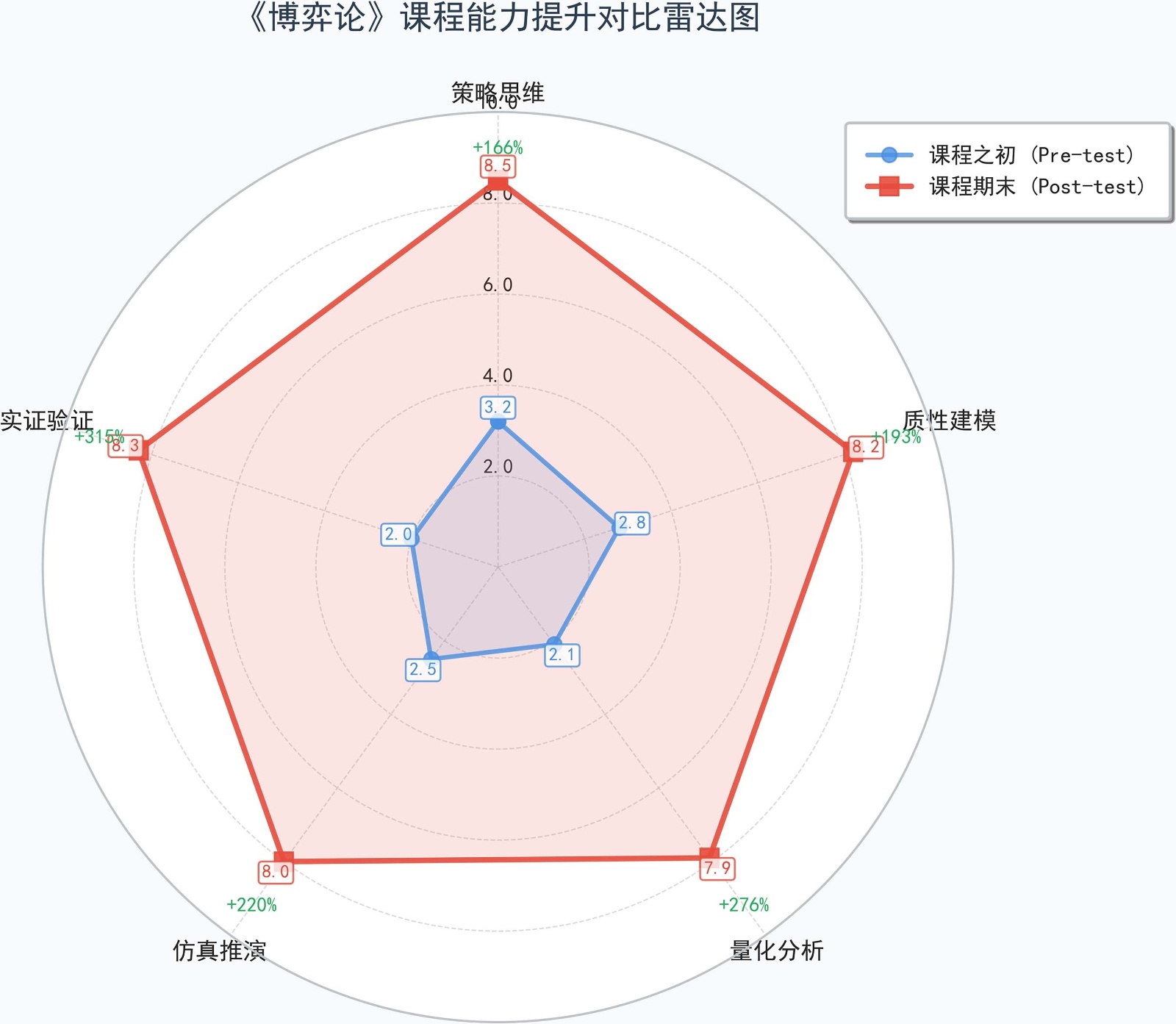 通过“理论嵌入–质性建模–仿真推演–现实验证”的四阶教学框架的设计实施,《博弈论》课程成功实现了从单向知识传授向应用能力培养的转变,使得政法类学生能够更好地应对复杂的治理场景。整个教学框架使学生们既能掌握博弈论核心理论,也能获得将理论应用于实际问题分析的综合能力。