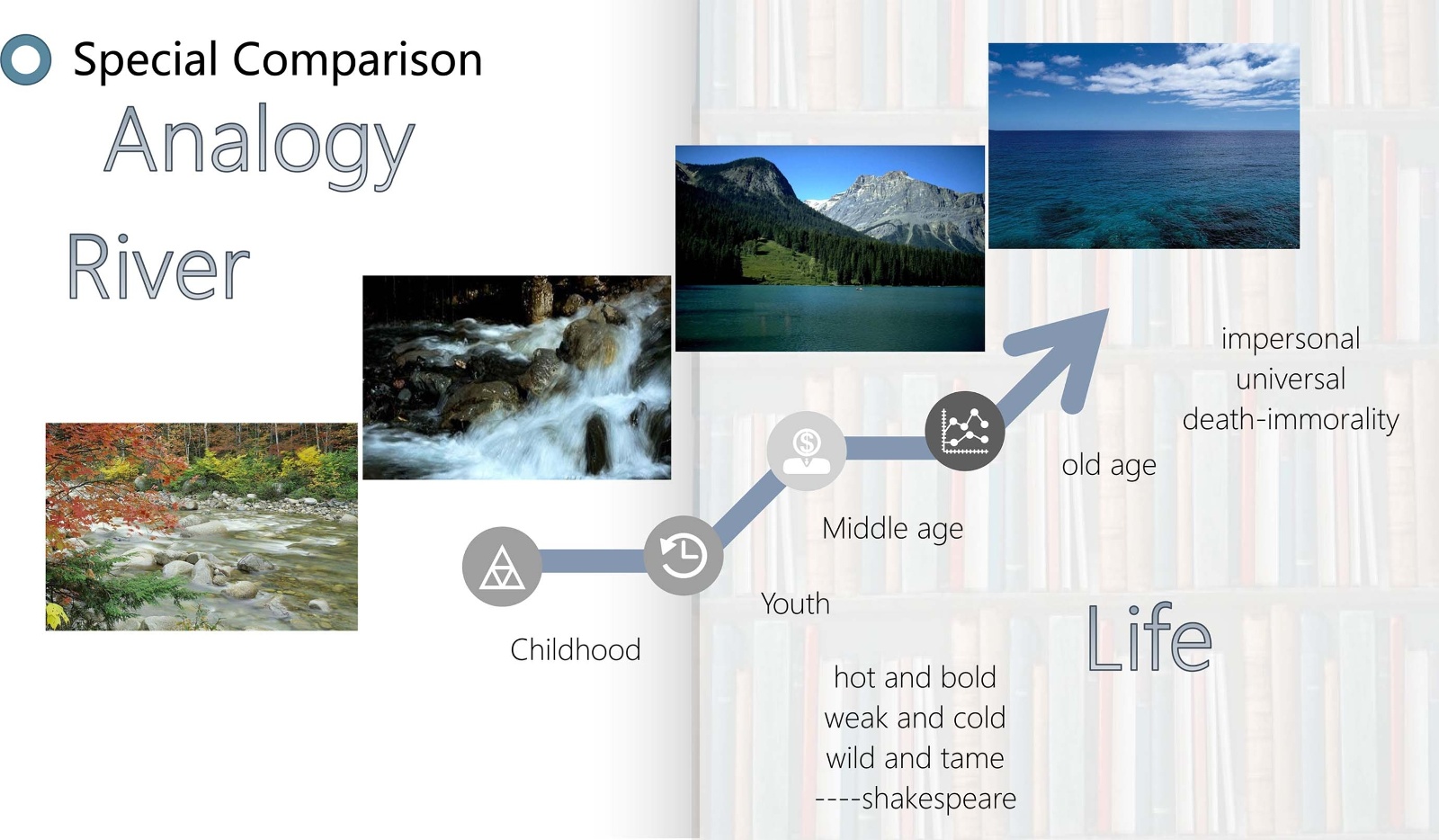 课中思辨阶段分为问题导入与文本分析阶段、价值探讨与反思阶段和跨文化比较与升华阶段。第一步笔者情境导入,激发共情。以“What can you compare life to?”(你将人生比作何物?)开放式问题切入,激活学生的生活体验与哲学初思。第二步引领学生细读文本——教材上罗素《老之将至》片段,引导学生为《老之将至》文本内容绘制思维导图,呈现罗素“人生如河”的比拟逻辑,之后借助PPT为学生清晰展示罗素的比拟逻辑,如图2所示。