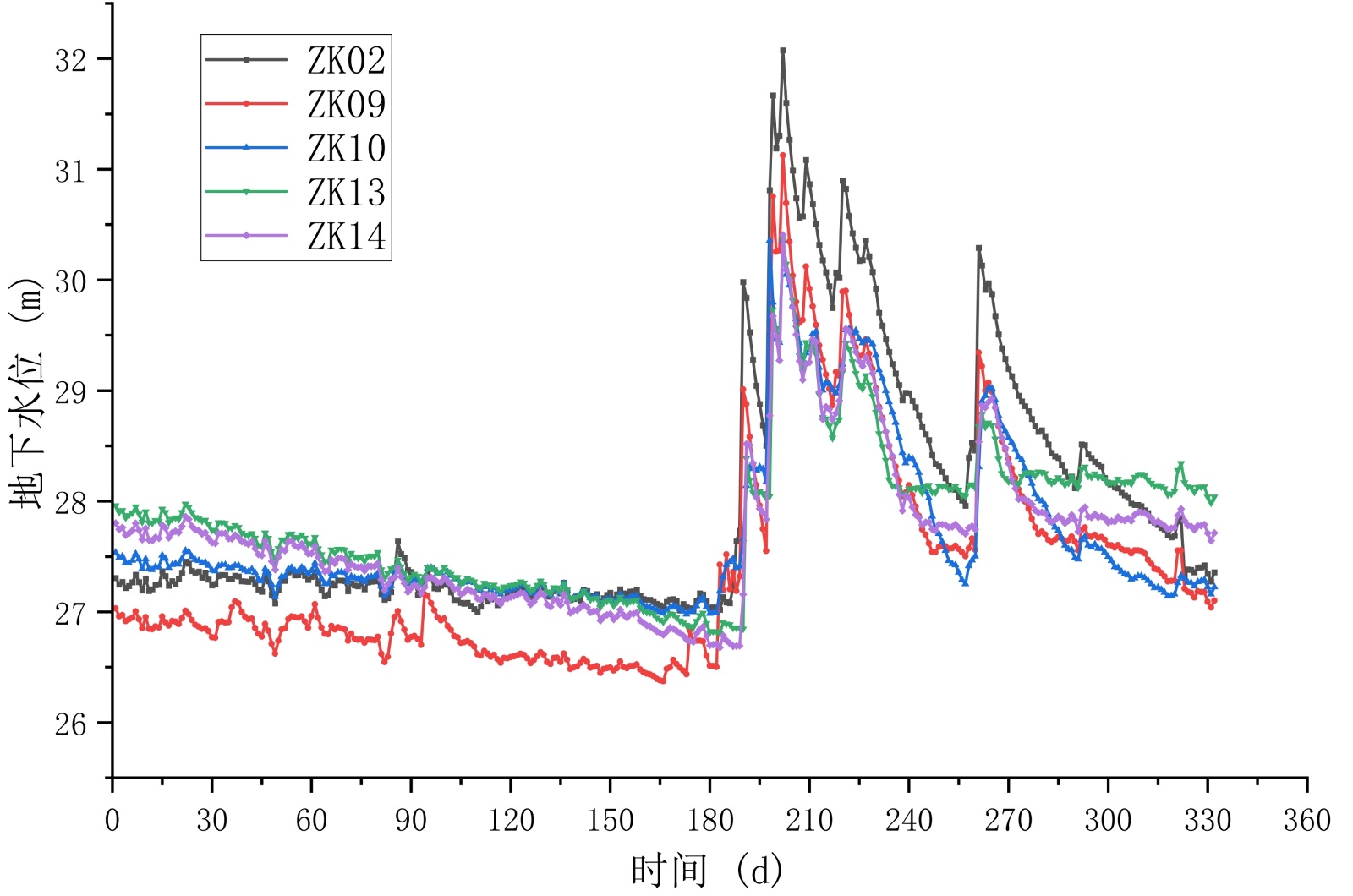 墓区地下水位监测依托ZK02、ZK09、ZK10、ZK13、ZK14等孔,连续记录了2024年降雨过程下的水位变化,如图2所示。结果表明,水位突涨普遍与前1~3 d集中降雨密切对应,地下水对大气降雨响应明显;枯水期以ZK13水位最高,其次为ZK09、ZK14,ZK10、ZK02较低,强降雨后则以ZK02抬升幅度最大,反映其附近岩土体渗透性相对较高。结合地形及运河水位条件,京杭运河为墓区提供稳定基础水位,人为用水影响较小,大气降水是引起地下水短期暴涨的主控因素。高程分析显示,附属10室底板标高约27.04 m,运河百年一遇洪水位为27.99 m;监测记录表明,当10室底板处水位达28.595 m时墓室尚未渗水,综合裂隙不确定性后可将底板起渗水位保守取为约28.1 m,即仅在暴雨致地下水位抬升至该高程以上时,才可能通过底板裂隙产生压力型渗水,对墓室安全构成直接威胁。