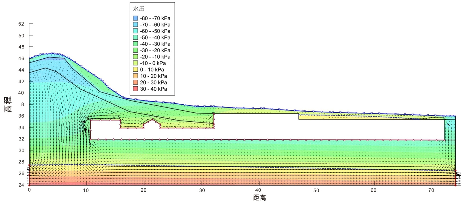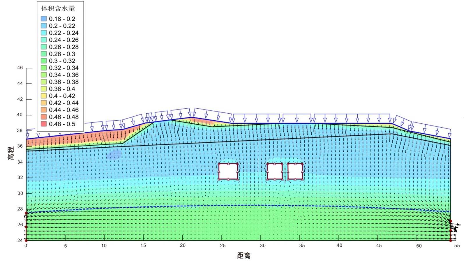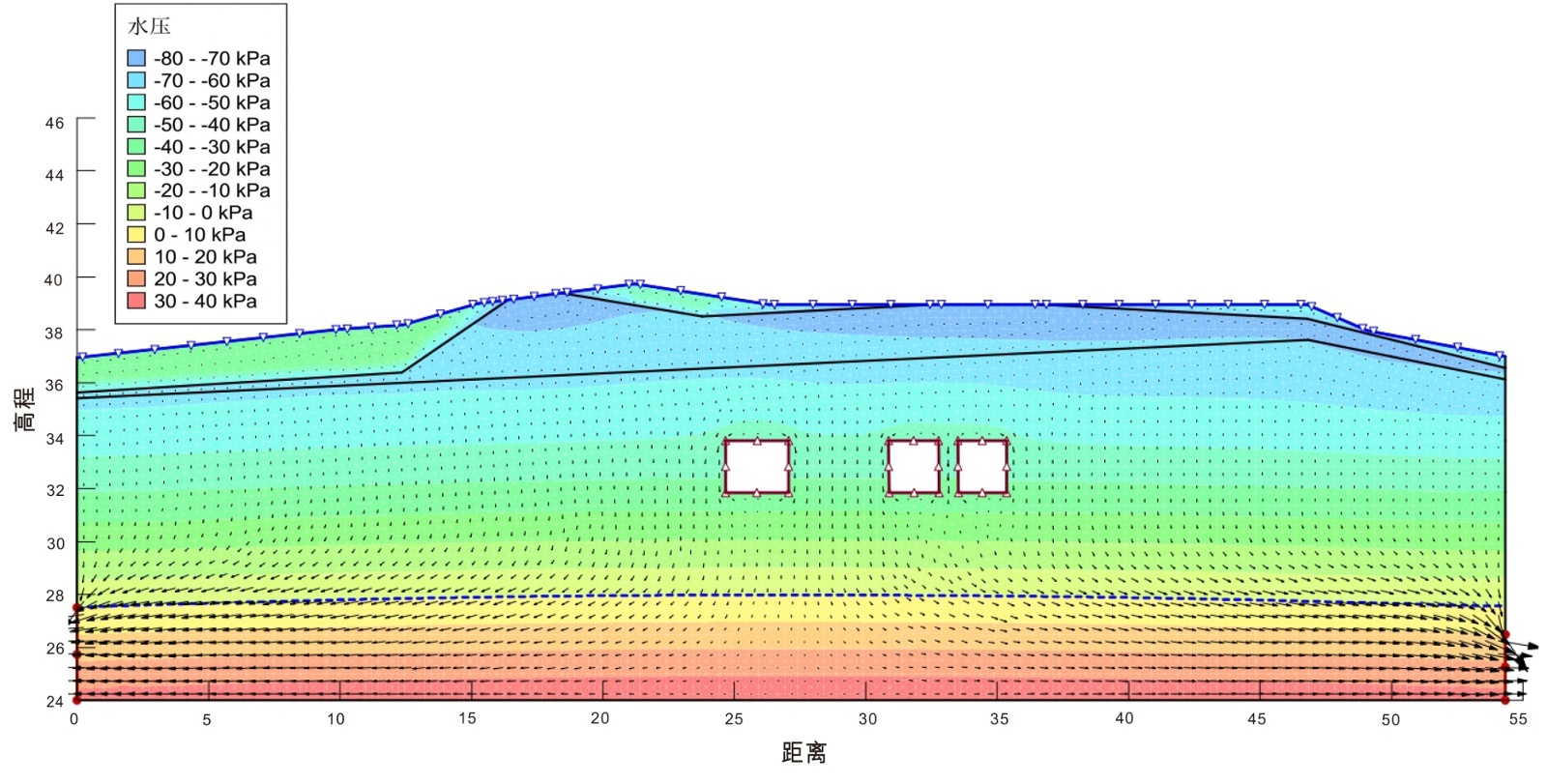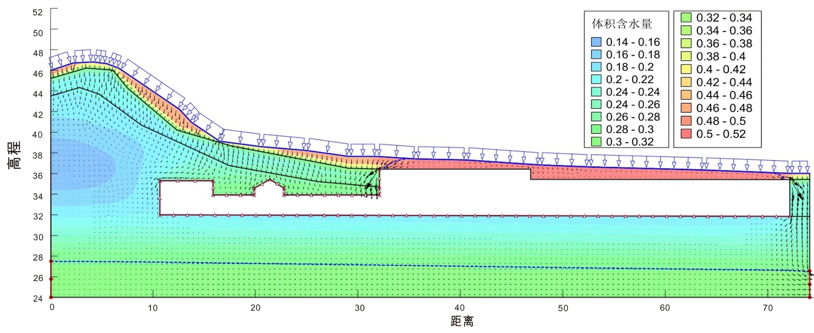 在模型中,将逐日降雨量转化为坡面入渗边界的时间函数,模拟雨水在包气带中的连续入渗和运移。以孔隙水压力和体积含水量为主要指标,跟踪从初始稳态到7月强降雨峰值再到计算末期的渗流场演化,据此识别优先渗水通道和潜在渗水薄弱区。