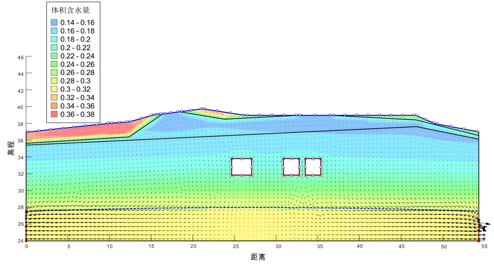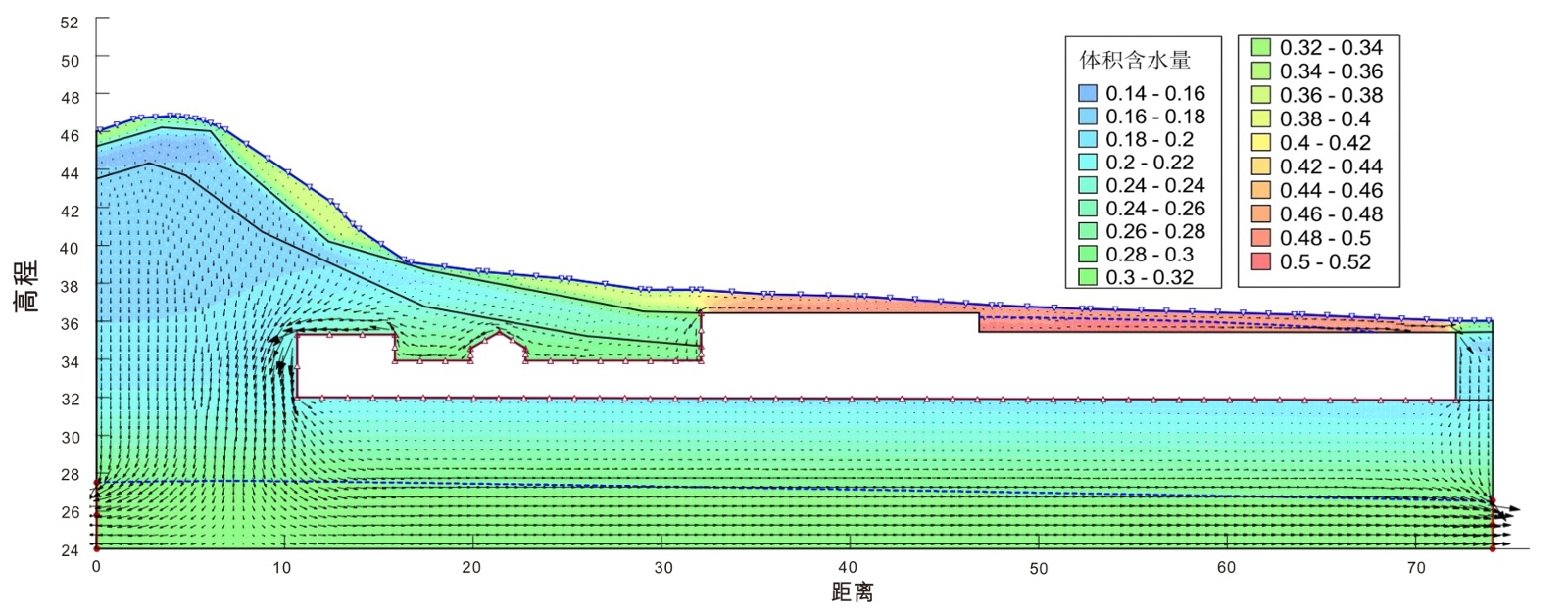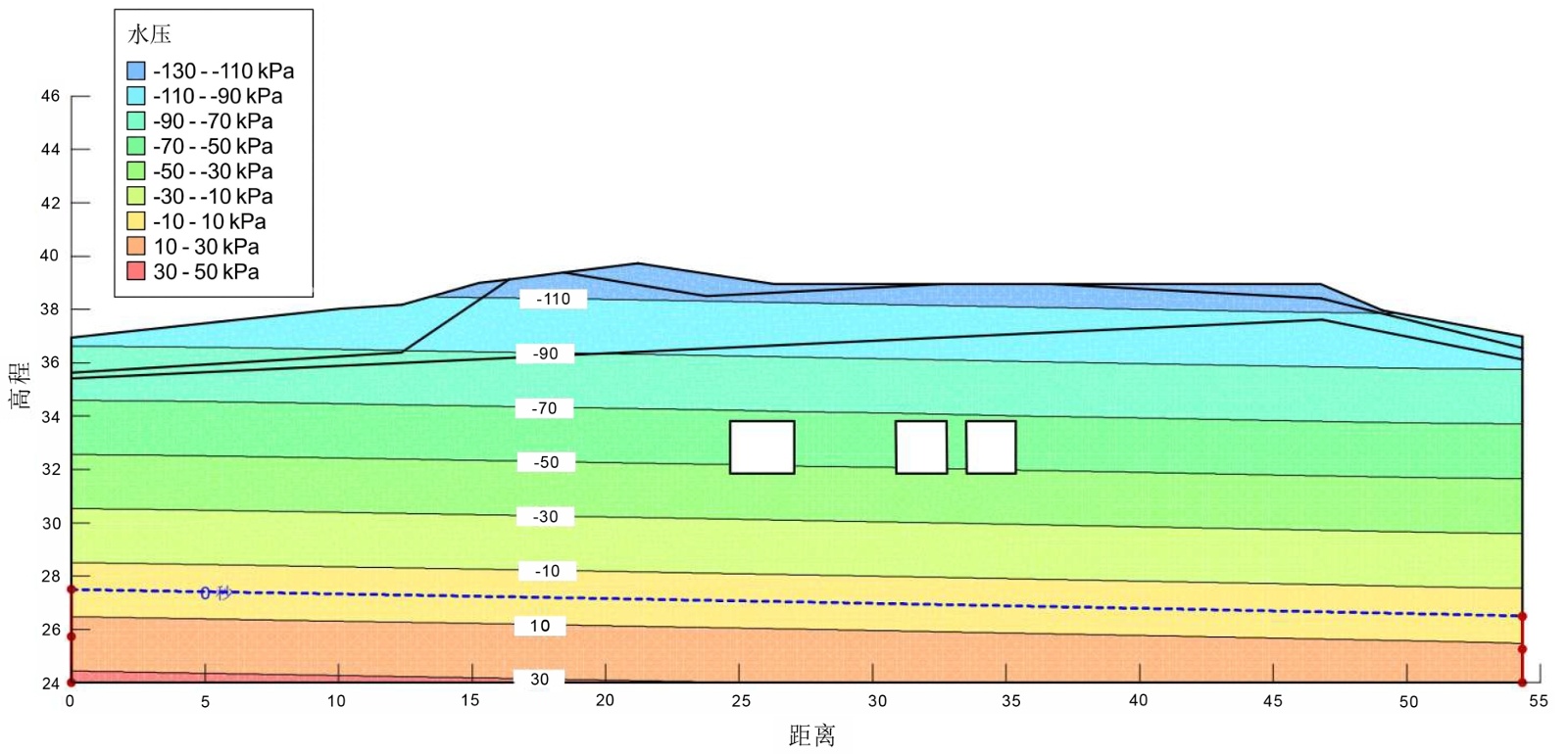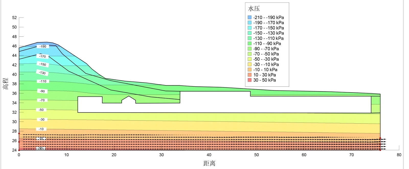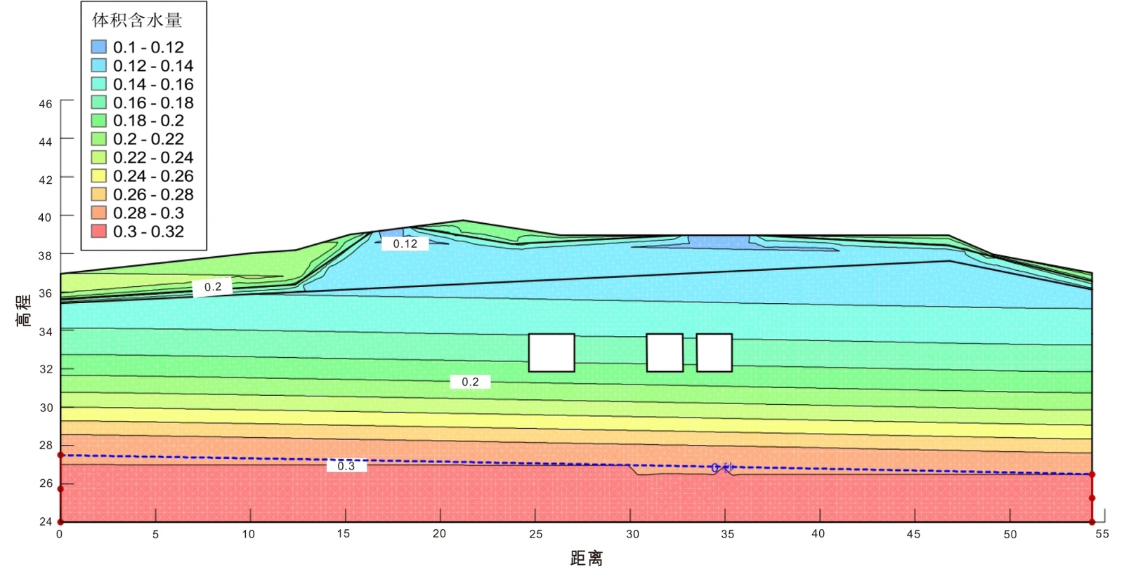 在模型中,将逐日降雨量转化为坡面入渗边界的时间函数,模拟雨水在包气带中的连续入渗和运移。以孔隙水压力和体积含水量为主要指标,跟踪从初始稳态到7月强降雨峰值再到计算末期的渗流场演化,据此识别优先渗水通道和潜在渗水薄弱区。