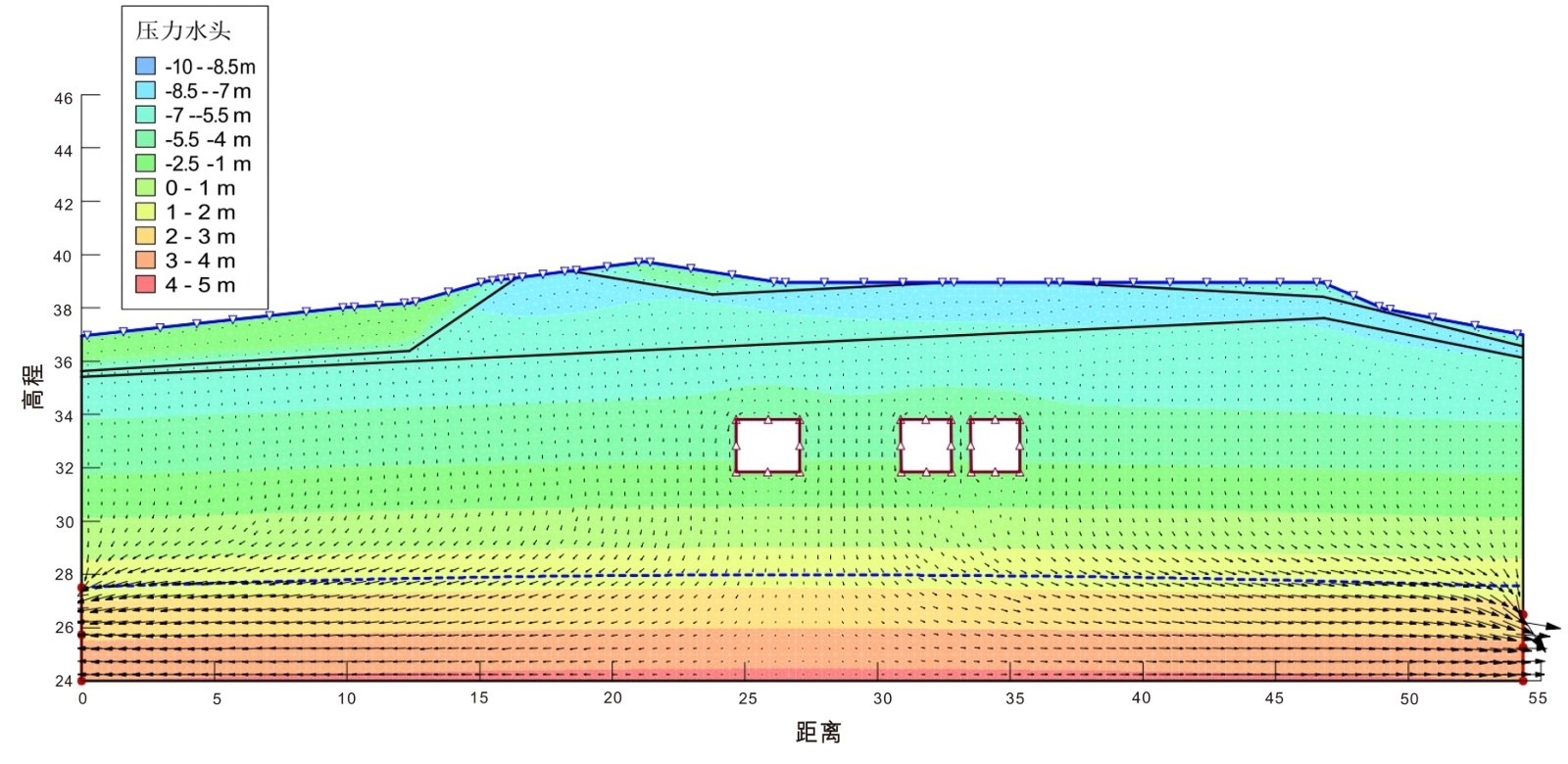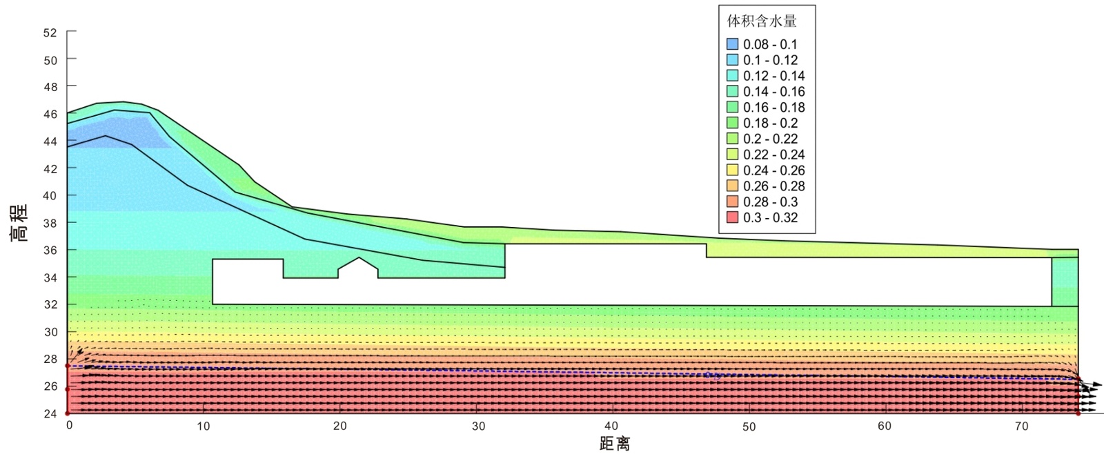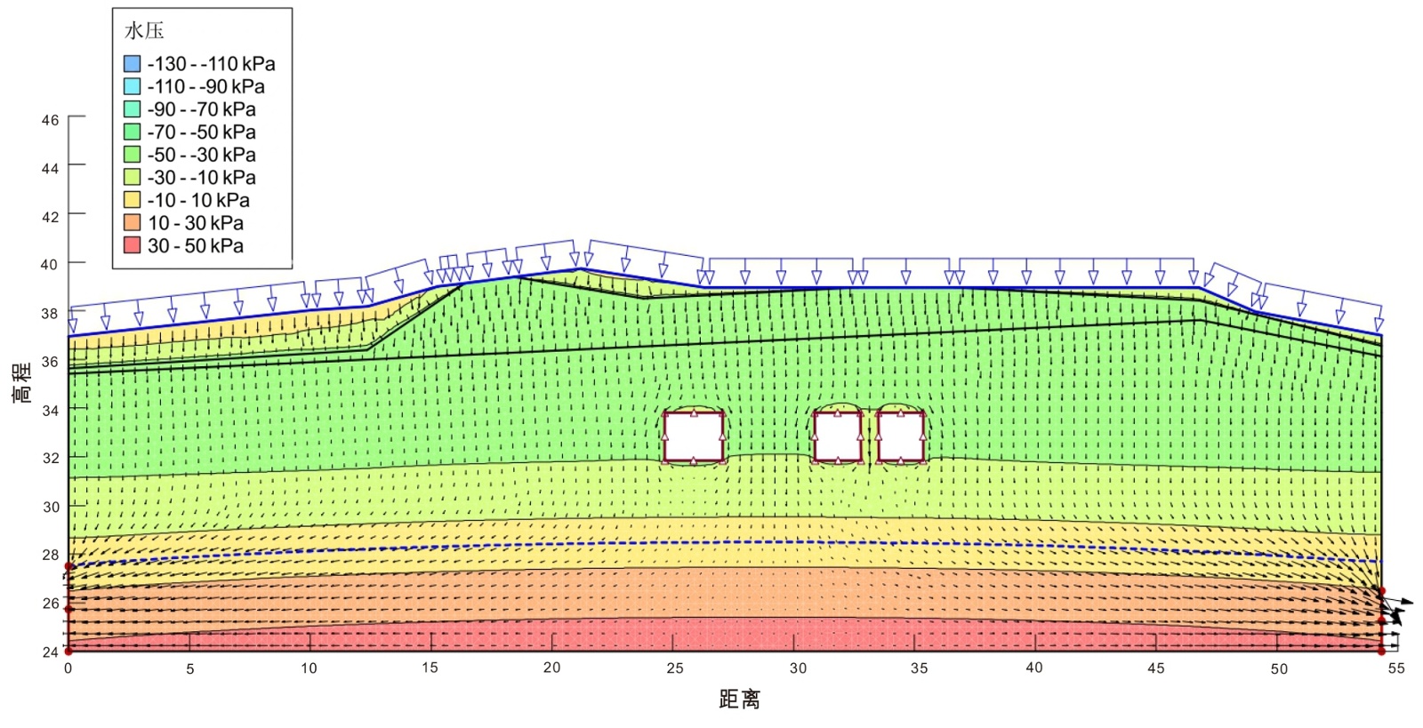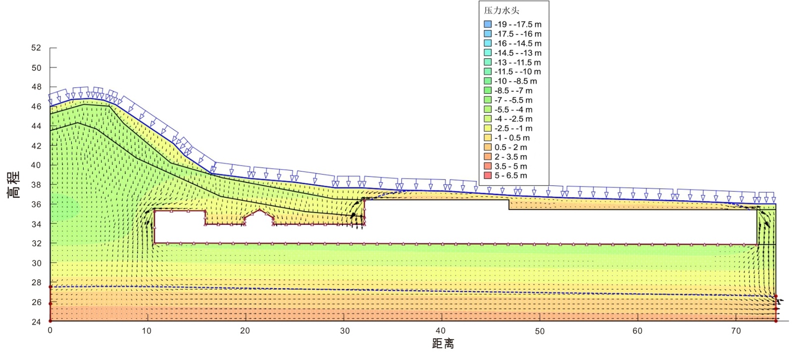 在模型中,将逐日降雨量转化为坡面入渗边界的时间函数,模拟雨水在包气带中的连续入渗和运移。以孔隙水压力和体积含水量为主要指标,跟踪从初始稳态到7月强降雨峰值再到计算末期的渗流场演化,据此识别优先渗水通道和潜在渗水薄弱区。