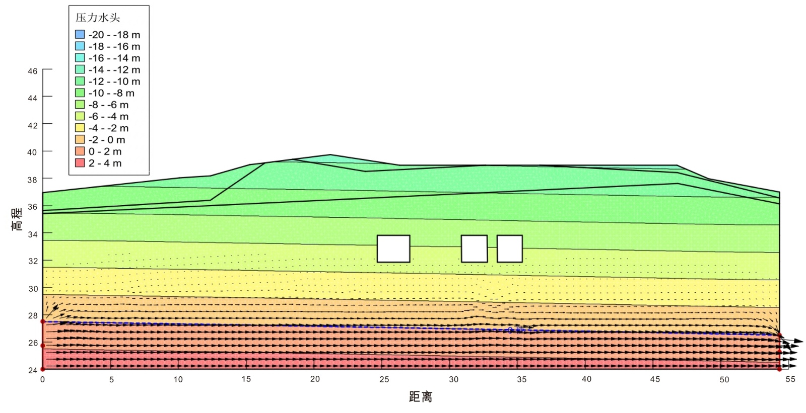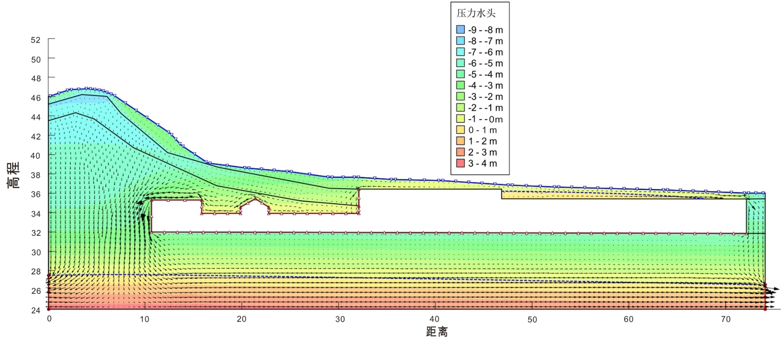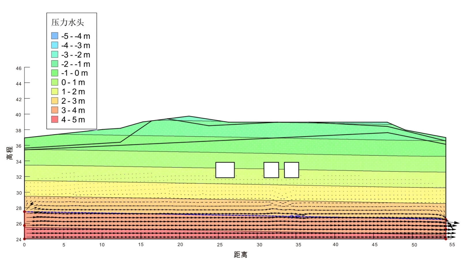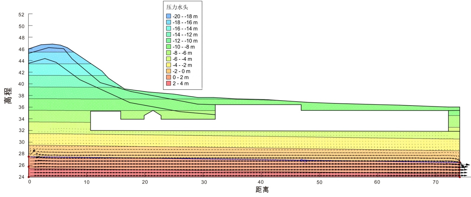 在模型中,将逐日降雨量转化为坡面入渗边界的时间函数,模拟雨水在包气带中的连续入渗和运移。以孔隙水压力和体积含水量为主要指标,跟踪从初始稳态到7月强降雨峰值再到计算末期的渗流场演化,据此识别优先渗水通道和潜在渗水薄弱区。