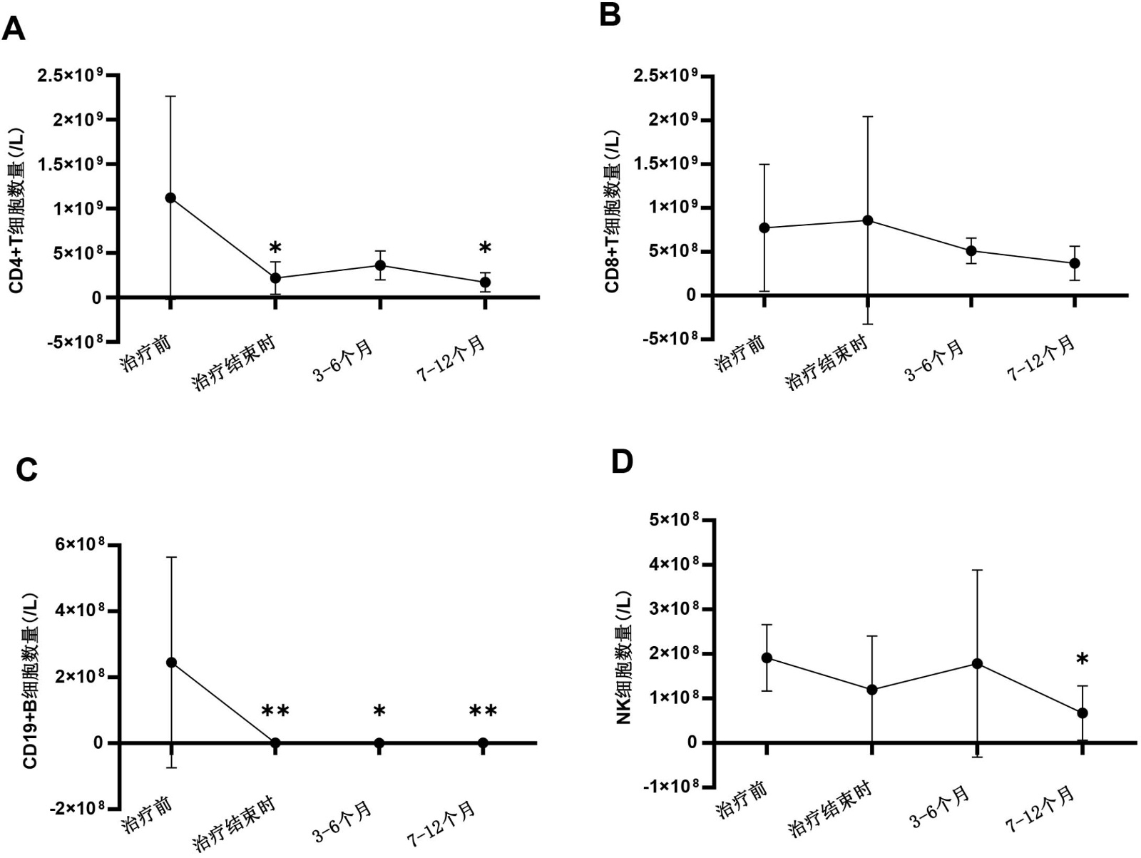 + B细胞计数均在诱导治疗期间显著下降[0.181 (0.033~0.628) × 10