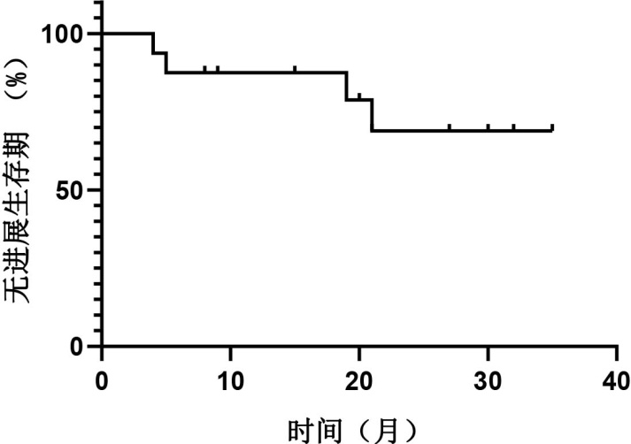 截至2024年10月30日,16例患者中位随访27 (8~35)个月,3例患者疾病进展,1例死亡,1年和2年的PFS率分别为87.5%和68.9% (见图2)。