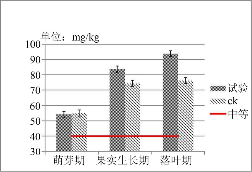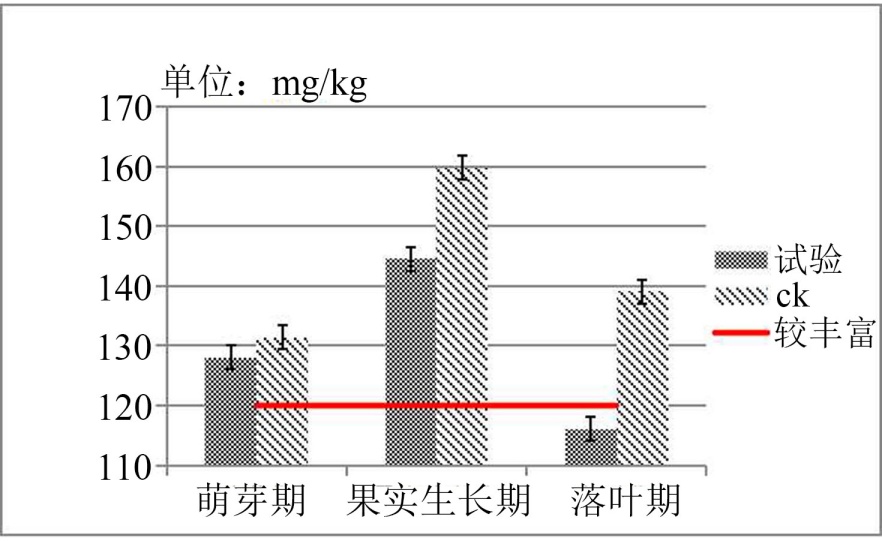 由图1可知,不同时期土壤碱解氮的含量有所差异,均呈现出低–高–低的趋势,即果实生长期呈现上升趋势,最大值达到179.17 mg/kg,落叶期呈现下降趋势,但均处于土壤碱解氮较丰富状态。其中试验地块落叶期为116.09 mg/kg下降明显,可能是因为试验地块的需氮量较高。