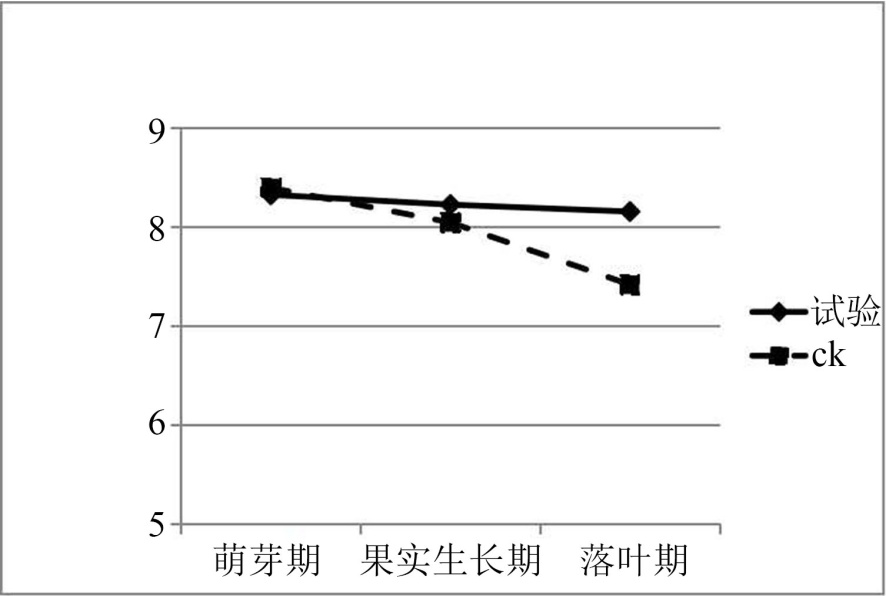 土壤pH影响着土壤养分的有效性,进一步影响植株养分的吸收。如图4所示,土壤pH值随着生长期的推进而下降,试验地块的下降速率慢于CK,原因可能是由于试验地块的果实小、产量较低,养分需求量较少,根系分泌有机酸较低,导致土壤pH下降速率缓慢。