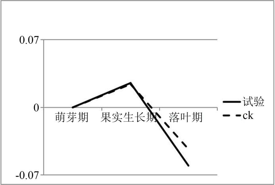 如图5所示,土壤含水量的增长率趋势为先上升后下降,整体趋势一致。果实生长期试验地块的含水量增长率为2.53%,CK为2.40%,增长量基本一致,但是到落叶期试验地块明显比CK的增长率低。可能是因为果实生长期架下草覆盖率高,蒸发量降低从而提高了土壤含水量,落叶期时,试验地块根系多,需水量大,导致含水量下降趋势明显。