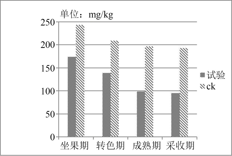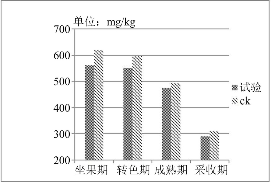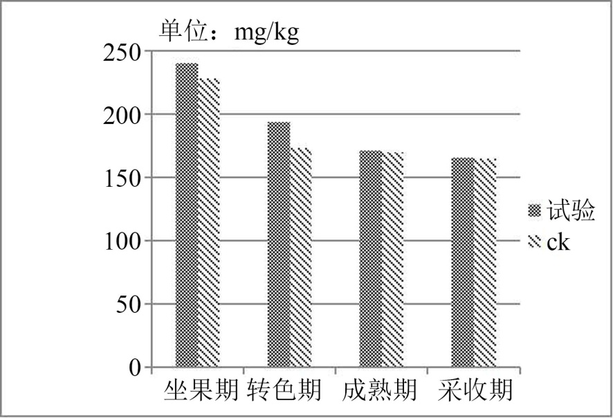 由图7可知,叶片有效磷呈现缓慢下降趋势,不同时期的叶片对磷的需求量存在差异,坐果期到转色期磷含量下降明显,说明叶片磷向果实转移,成熟期与采收期磷含量趋于稳定,说明后期果实对磷需求少。试验地块与CK的平均有效磷含量分别为137.24 mg/kg和216.52 mg/kg,CK的叶片磷含量明显高于试验地块,可能是因为前期土壤中,根系吸收受影响。
