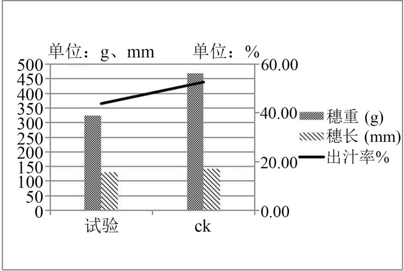 由图10可知,不同处理对果穗质量影响较大,其中穗重差异明显,试验地块穗重为325克,ck为468.75克,每穗约差143.75克,ck地块比试验地块每亩多大约69千克。另外穗长也存在差异,试验地块平均穗长13.12厘米,ck平均穗长14.25厘米。出汁率的差异也较为明显,ck比试验地块出汁率高8.83%。