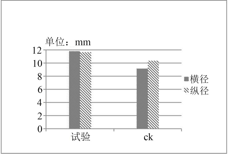 由图11可知,果粒大小存在明显差异,试验地块的横径和纵径相对一致,比ck果粒横径大2.64毫米,纵径大1.31毫米。试验地块果粒近似圆形,CK近似椭圆形。