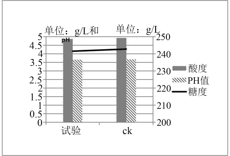 由图12可知,果实品质的差异不明显,试验地块的糖度略低于ck地块1.23 g/L,酸度和pH值基本一致。