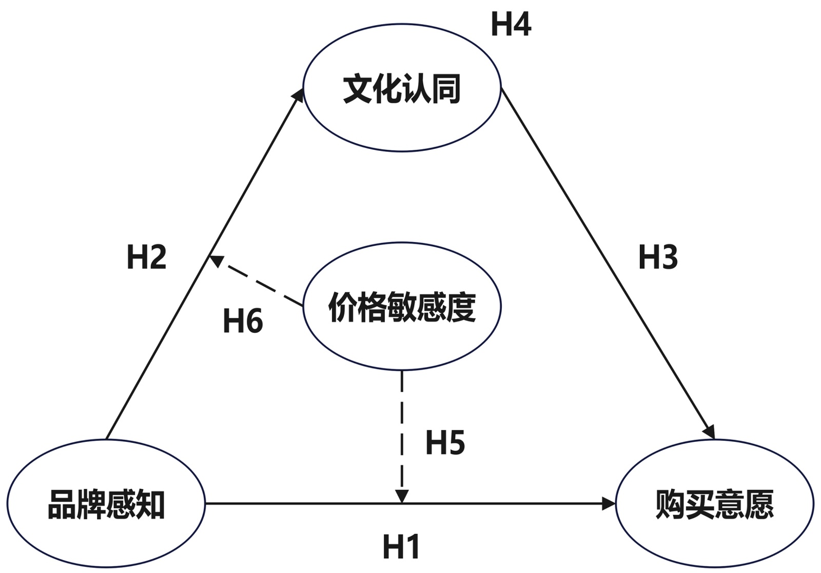 H6:乡村旅游者对旅游商品的价格敏感度调节品牌感知对文化认同的影响。