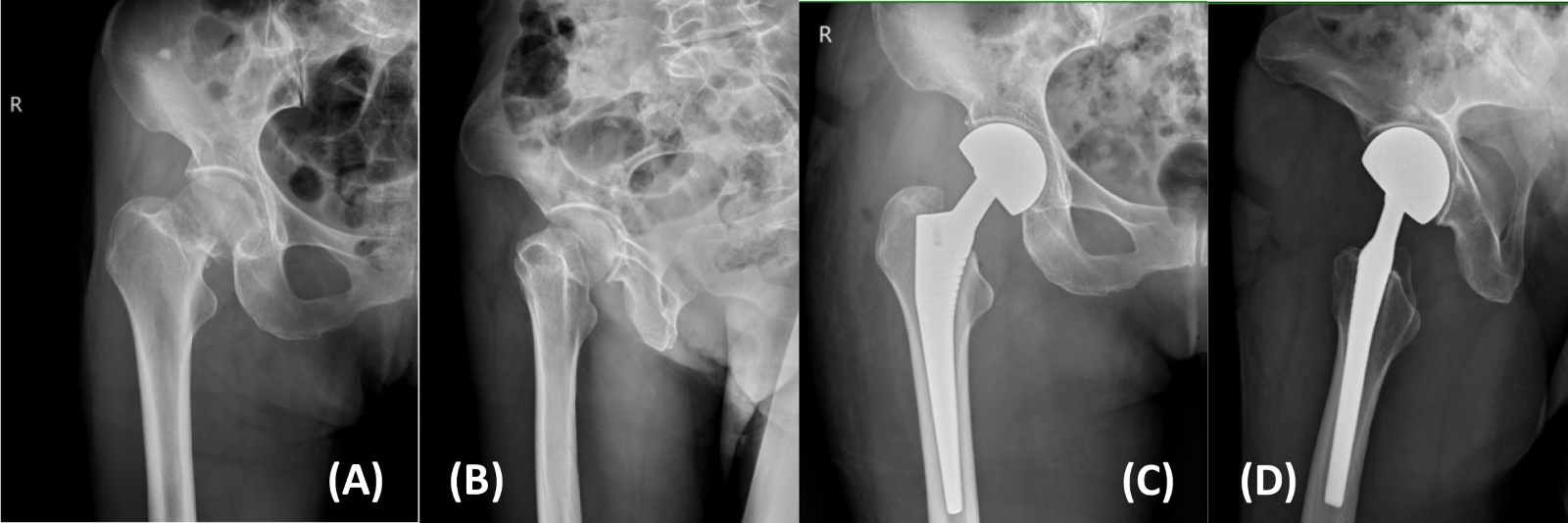图1. 70岁女性右侧股骨颈骨折(Garden III型)患者改良hardinge入路半髋关节置换手术前后X线片(A)、(B) 术前;(C)、(D) 术后