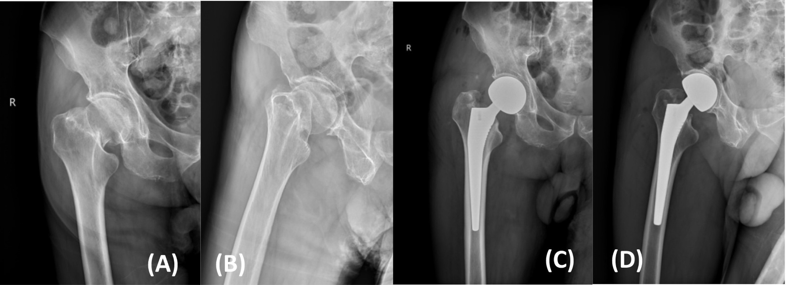 Figure 3. X-ray films before and after modified hardinge approach hemiarthroplasty in an 83-year-old male patient with right femoral neck fracture (Garden type III) (A), (B). Before operation; (C), (D). After operation