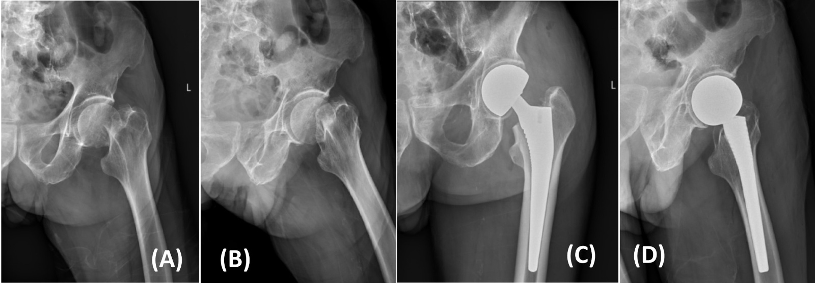 图2. 85岁女性左侧股骨颈骨折(Garden III型)患者改良hardinge入路半髋关节置换手术前后X线片(A)、(B) 术前;(C)、(D) 术后